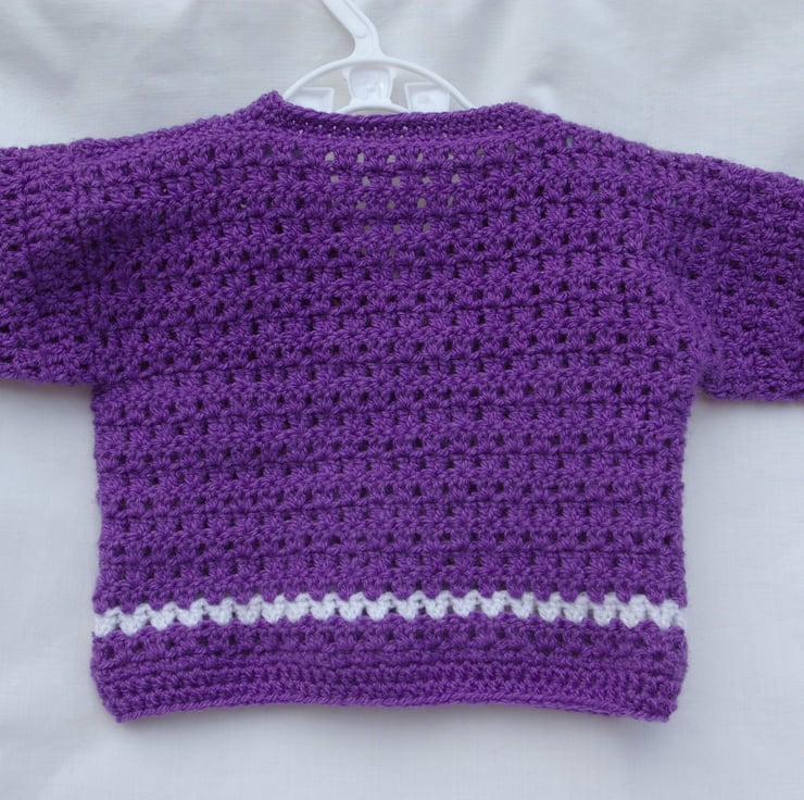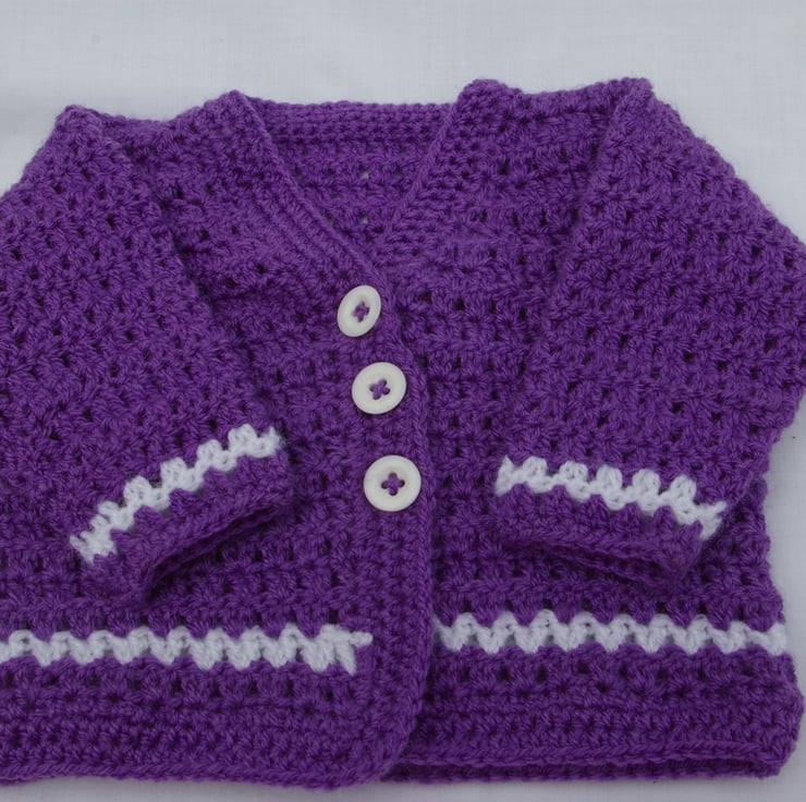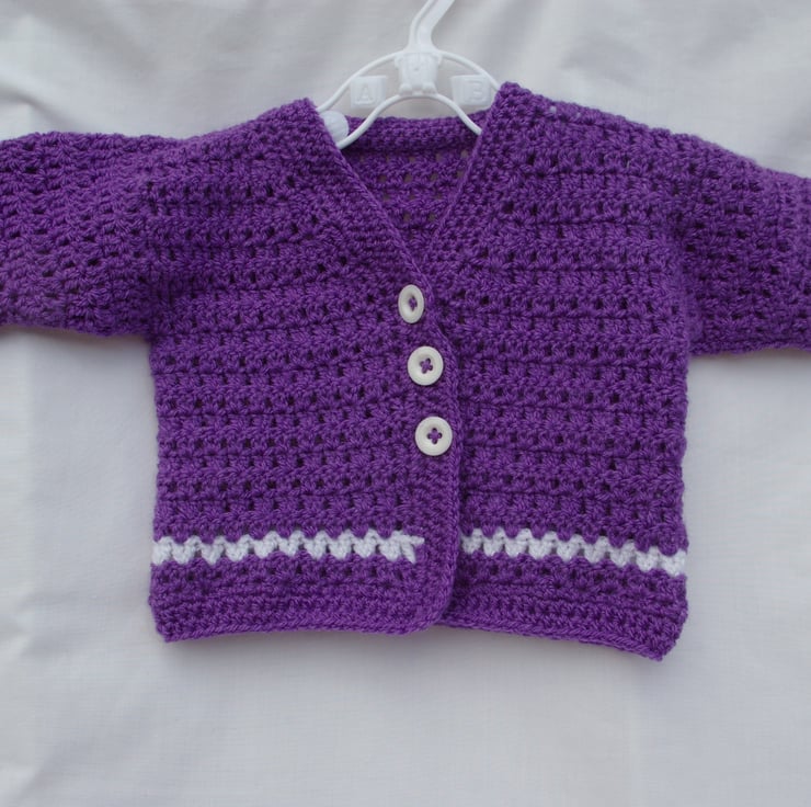 A crochet baby girl cardigan in purple. This little hand crochet baby cardigan is in the V-Neck style. I have used white to complement the purple by crocheting a row of white stitches around the cuffs and the rib of the cardigan. The cardigan fastens with three white buttons.