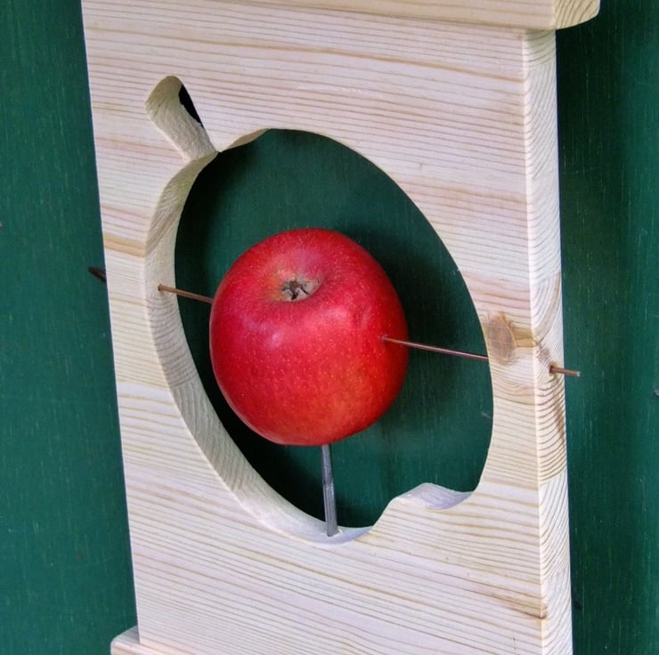 IT IS MADE FROM RECYCLED PINE AND HAS A VERTICAL SPIKE AND HORIZONTAL WIRE TO HOLD THE APPLE IN PLACE (APPLE NOT SUPPLIED I'M AFRAID).