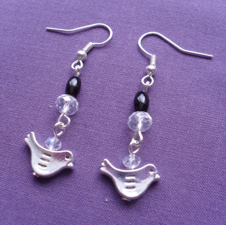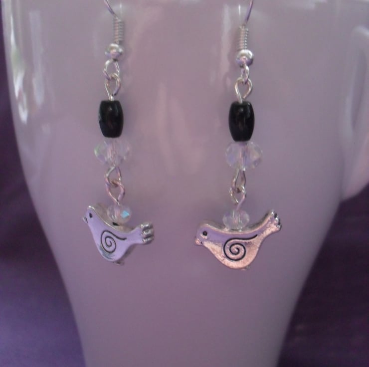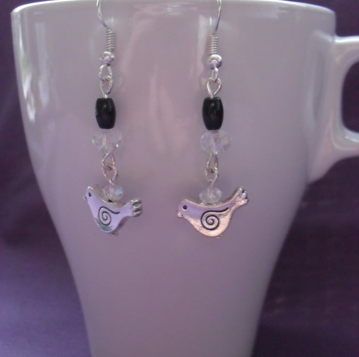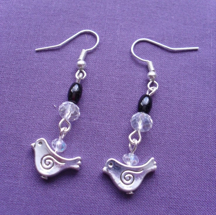 Little bird charms with aurora borealis crystals and 2 small black onyx beads