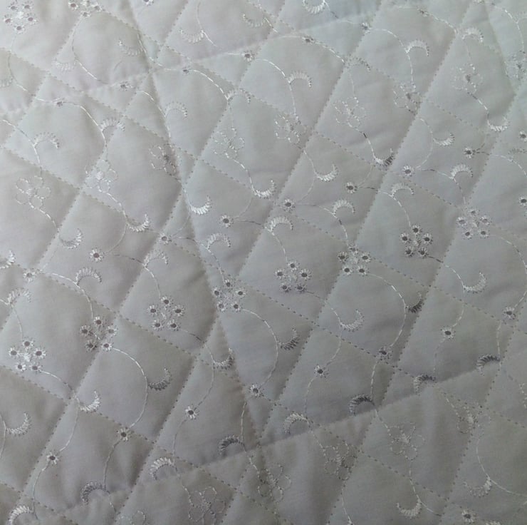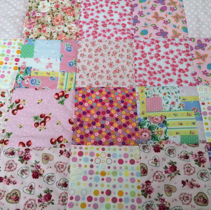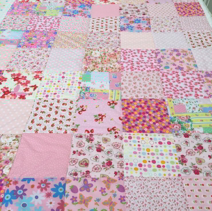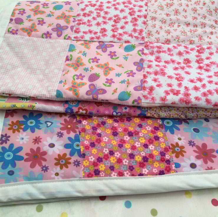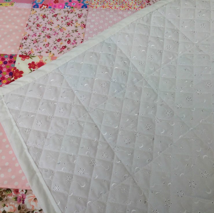 Gorgeous patchwork quilt , it measures 60 x 43." , and is made with pink cotton fabrics for the front and a white broderie anglaise fabric for the underside with a white cotton trim around the edge , it can be machine washed and line dried