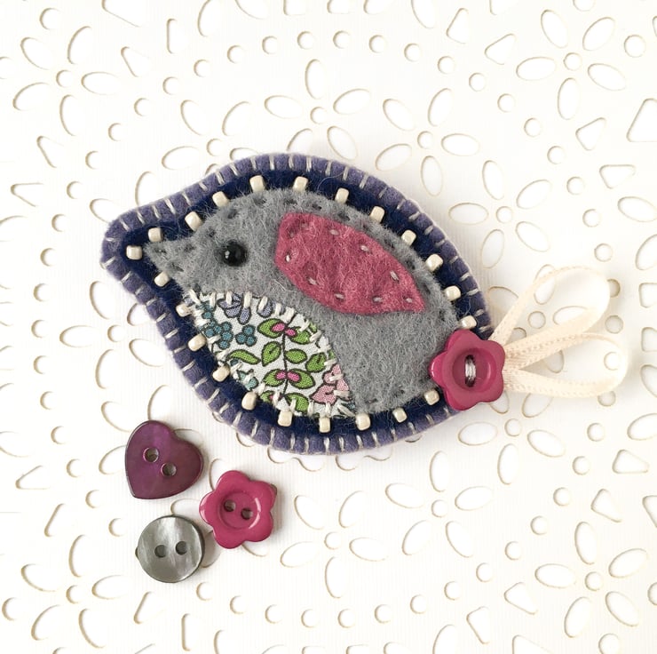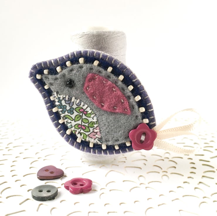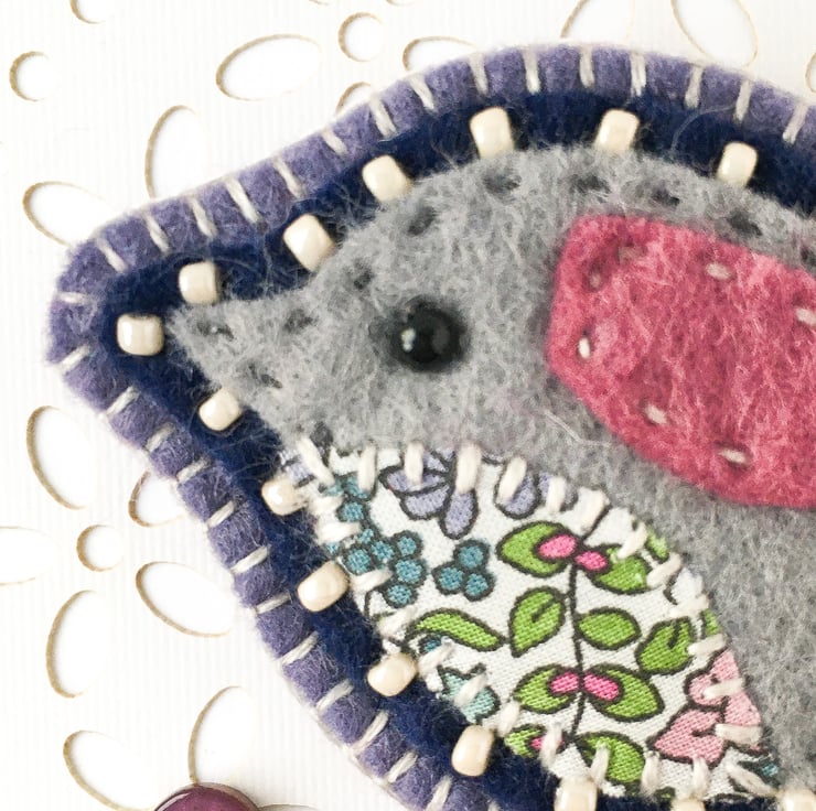 The bird is entirely hand stitched with an appliqué belly in pretty Liberty of London fabric and a little stitched wing in pink felt. It is mounted onto navy blue felt which is edged with cream seed beads and then further mounted onto onto soft purple felt backing. The bird is finished with a flower button and ribbon tail detail and has blanket stitch edging. There is a metal brooch pin on the reverse side for easy attachment.
