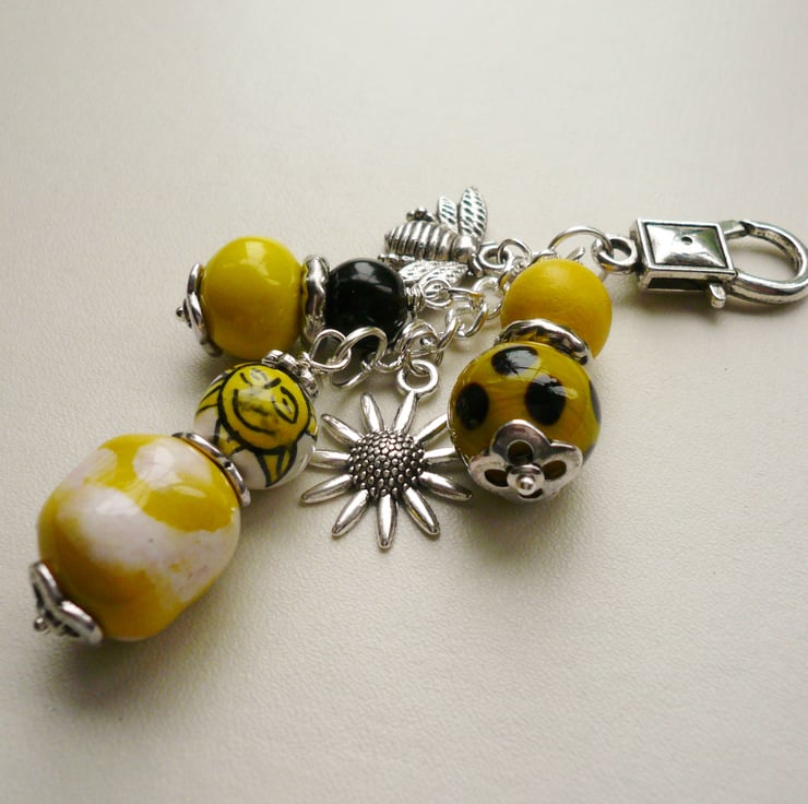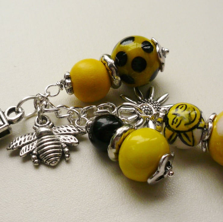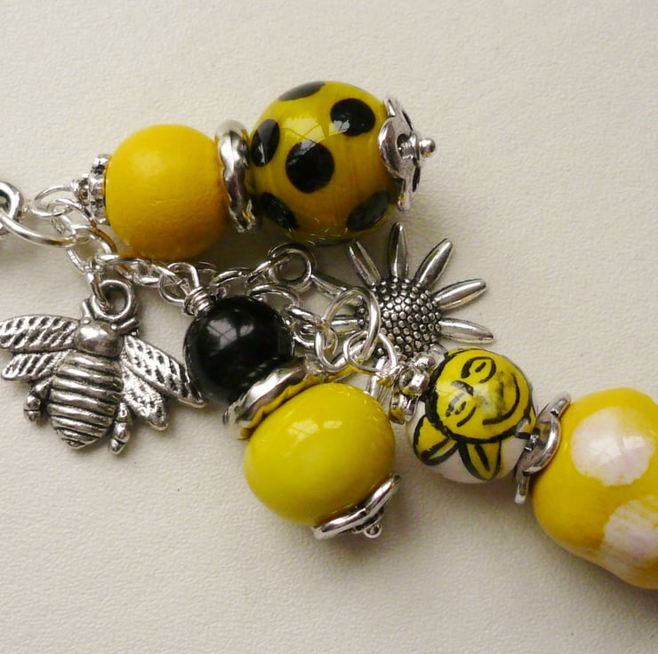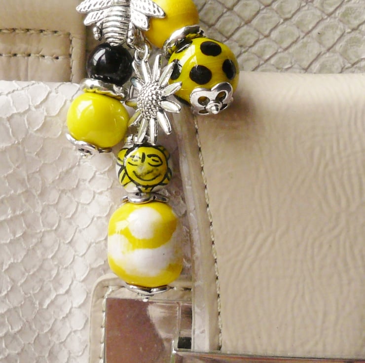 This handbag charm consists of black and yellow glass, wooden and ceramic beads including handmade and Peruvian hand painted ones, ranging in size from 8mm to 18mm. Spacers, bead caps and chain are all Tibetan silver plated as are the two honey bee and sunflower charms. All attached to a silver plated 28mm trigger clasp.