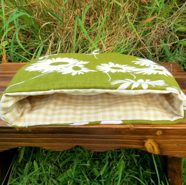 The lining is a cotton gingham, with an additional layer of cotton batting, to keep tea piping hot.