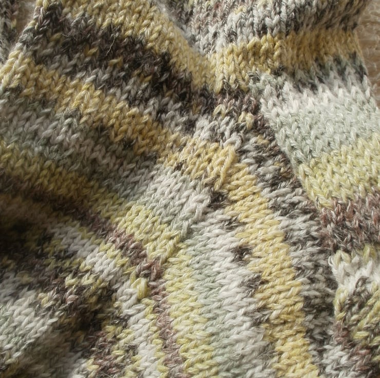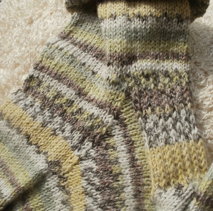 Lovely ankle length socks - knitted with a long cuff which makes them a bit slouchy - ideal for anyone with circulation problems as there's no elastic to cut into you. Perfect as bed socks! Or just for lounging around in. Made on five needles and knitted in the round, so no seams either. Fits up to a size 10.5/ 11 foot comfortably.