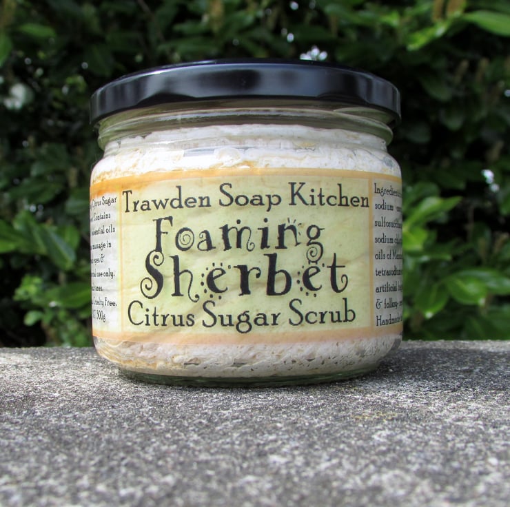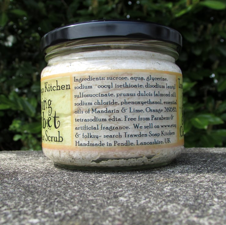 Foaming Sherbet Citrus Sugar Scrub with Mandarin and Lime essential oils, almond oil & loads of lovely organic fairtrade demerara sugar.