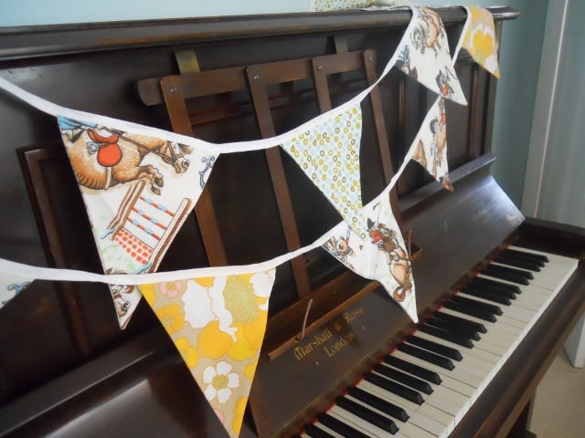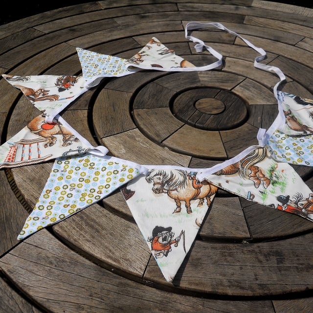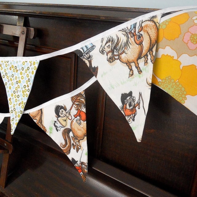 Immaculately made double sided bunting - the 'front' features the vintage fabric and the 'back' also features a mixture of floral cottons in pastel/blue/yellow shades