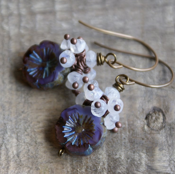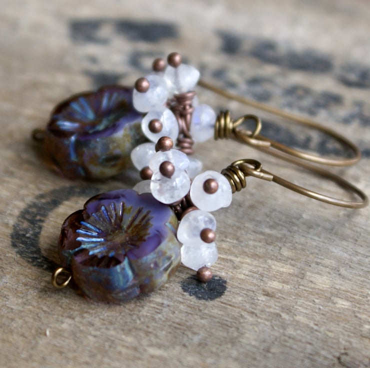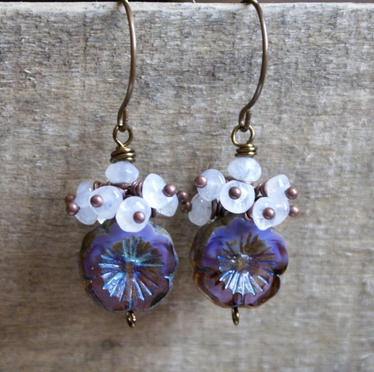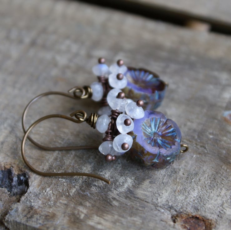 Moonstone Clusters - Lavender Czech Glass & Rainbow Moonstone Gemstone Cluster Earrings