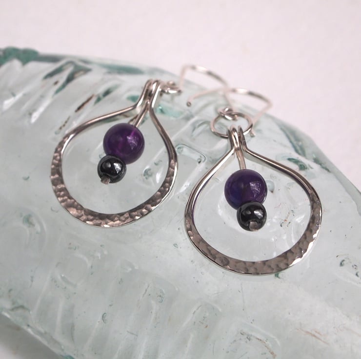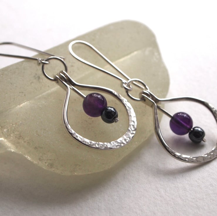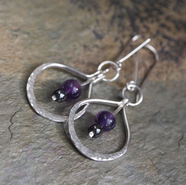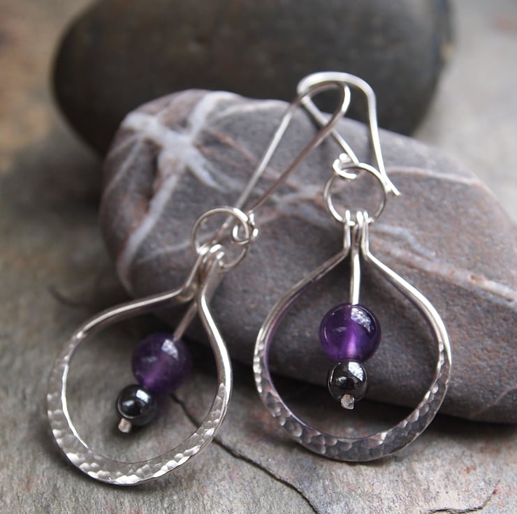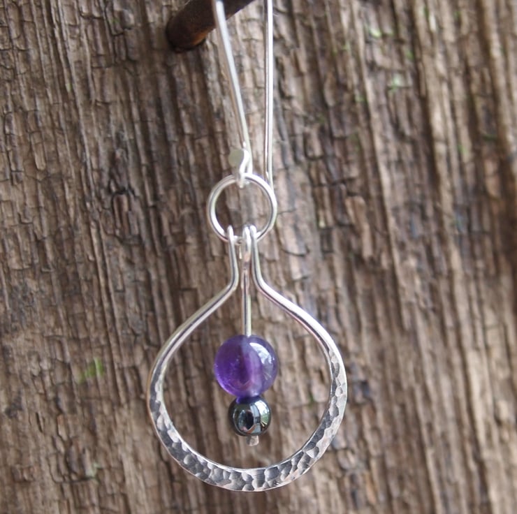These handmade sterling silver earrings have spheres of deep purple amethyst and smokey grey hematite. The beads are suspended on a silver hinged rod within a hand forged hoop of hammered sterling silver.