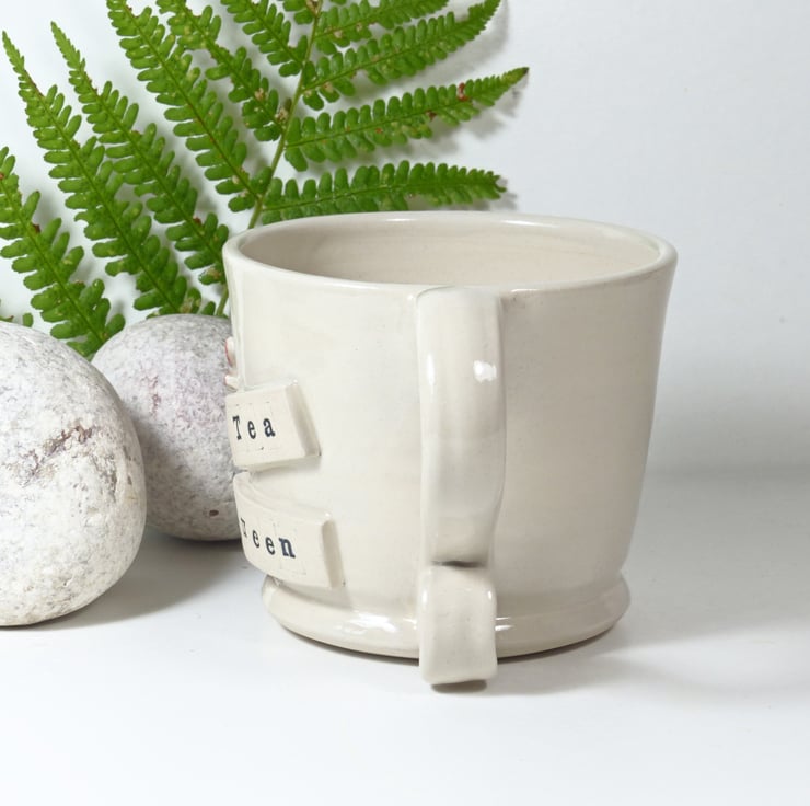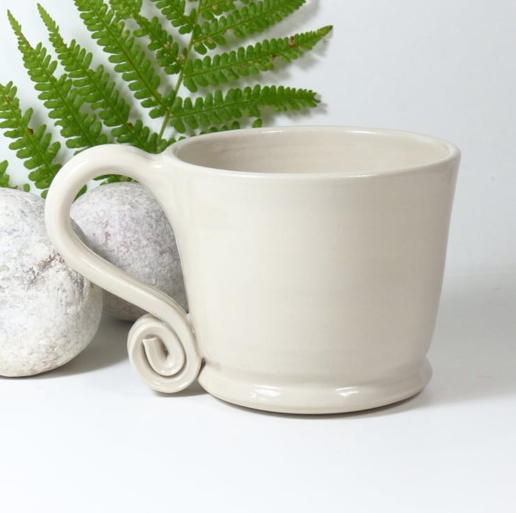 I threw this mug on the potter's wheel using a white stoneware clay. I then turned the base and added the handle and decoration before bisque firing the mug. I glazed it using a lovely transparent glaze and again fired it, this time to 1240C stoneware making it strong and durable.