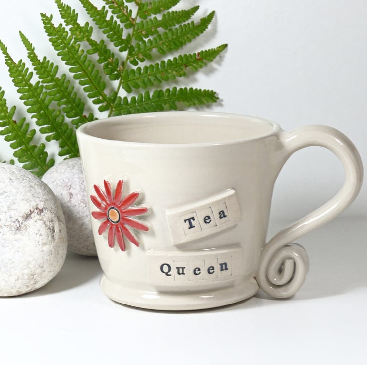 It has the words 'Tea Queen' stamped into raised clay and with a lovely flower in red and orange on the side of the mug.