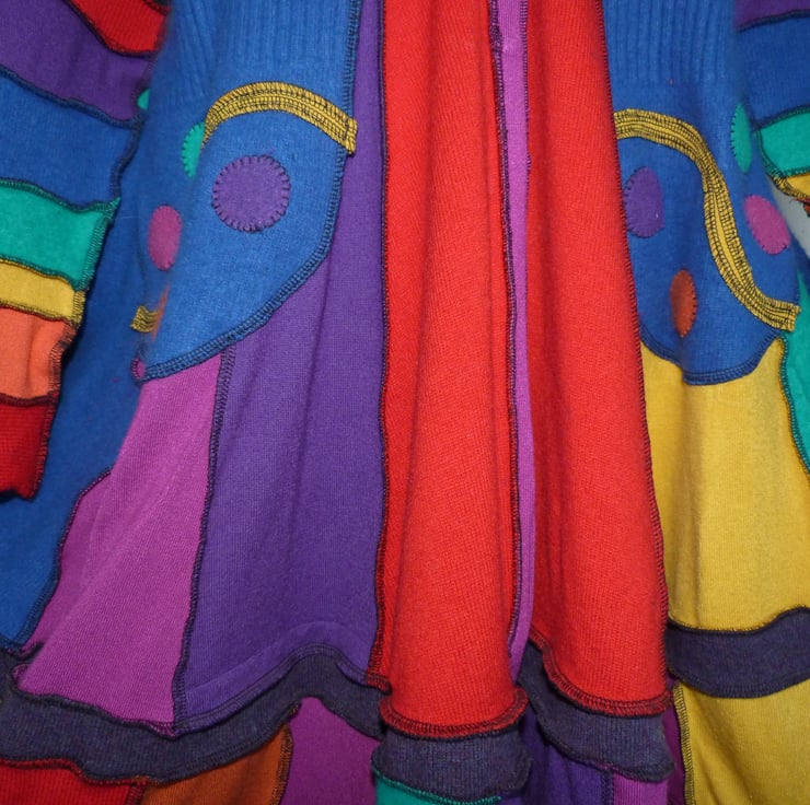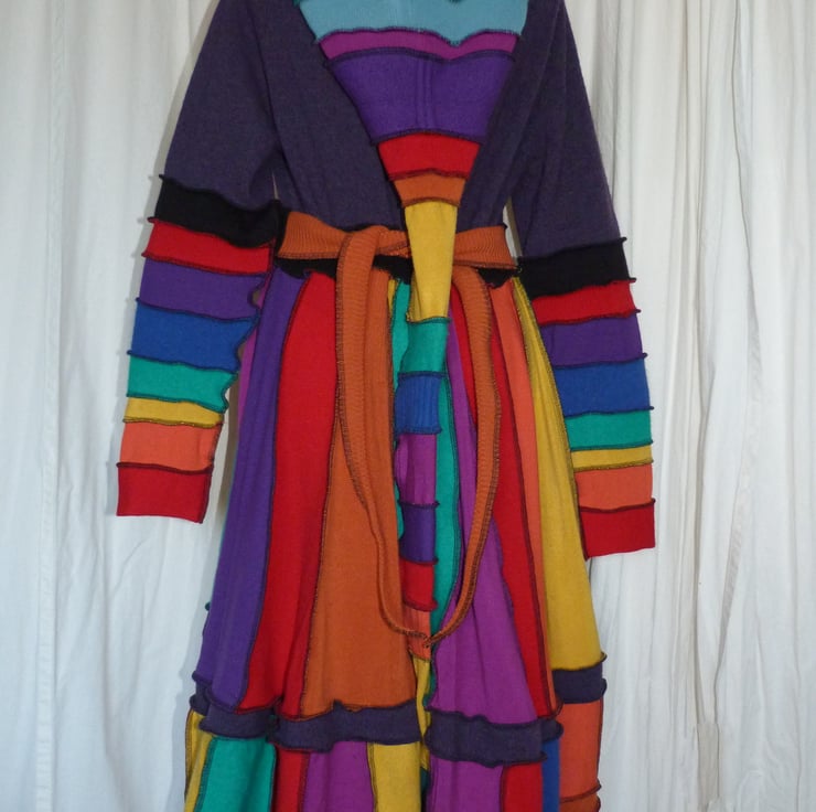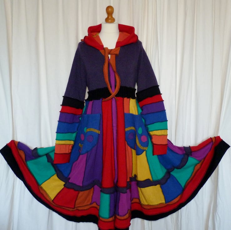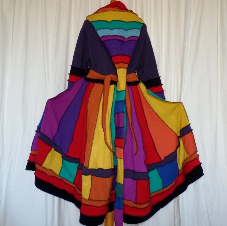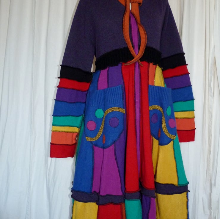 This fantastic up-cycled coat is created from mainly wool jumpers, with some angora and acrylic ones to create the full rainbow of colours. These are previously loved and recycled jumpers, that I have washed in a hot temperature and pre-shrunk. I have then cut and re-stitched the jumpers, with all seams being professionally finished with a serger/over-locker, to create this fabulous coat.