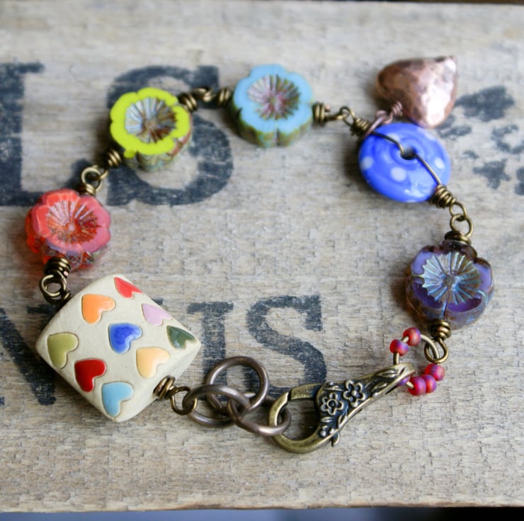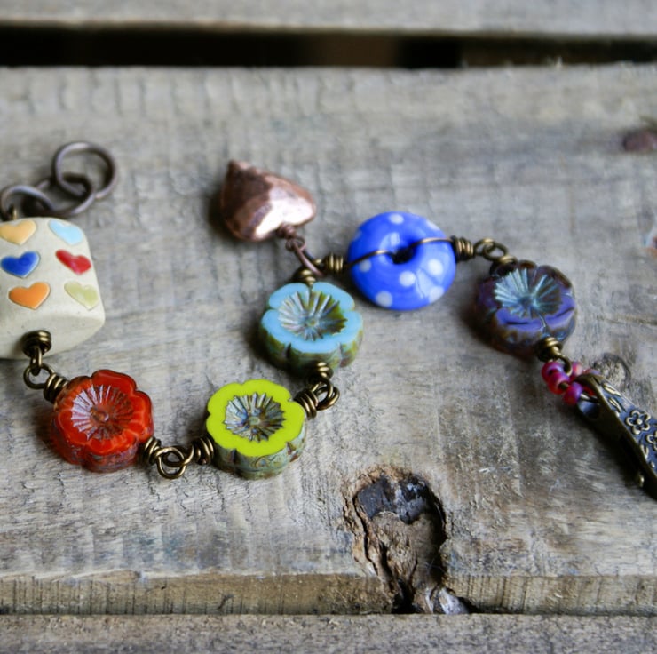 Rainbow Heart - Multi Coloured OOAK Wire Wrapped Czech Glass & Art Bead Bracelet
