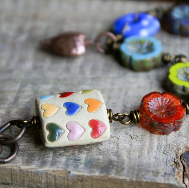 The bracelet is finished with a gorgeous ‘Hearts of Different Colours’ carved ceramic pillow bead, made by Golem Studio.