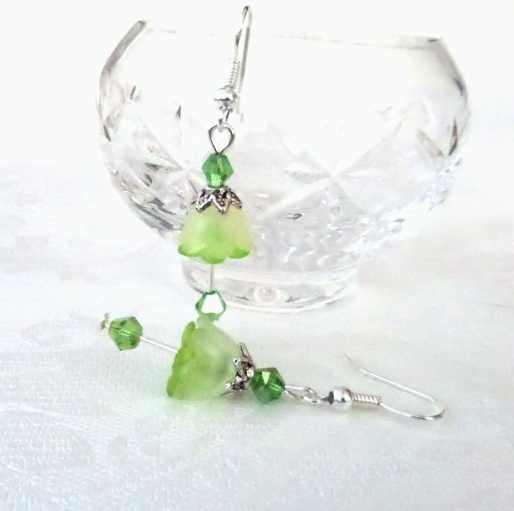 One of a kind flower shaped earrings, made with green and yellow lucite, tibetan silver and vivid green crystal.