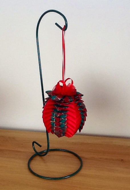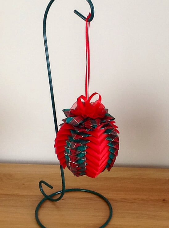 This lovely handmade Christmas Hanging Decoration has been made from a plain satin Red ribbon and a Red/Green Tartan plaid ribbon. I have used a 10cm Polystyrene ball and small sequin pins to make this decoration. The top has been tastefully decorated with contrasting ribbons.