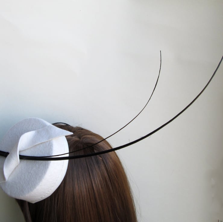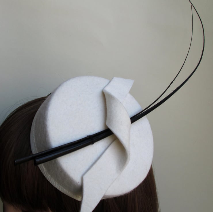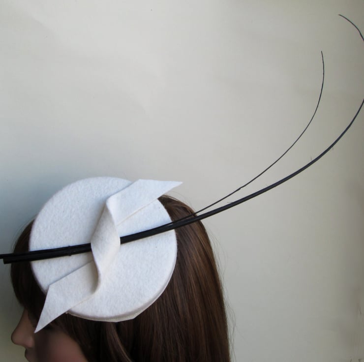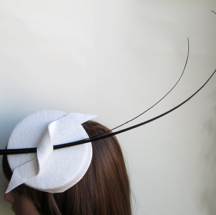 Make a statement in this gorgeous cream hat. Perfect for race day, weddings or any formal occasion, this stunning pill box style hat has been transformed with the addition of two black ostrich spines and finished off with a felt ribbon twist. It would also make a fantastic alternate bridal hat and can be finished with ivory spines if you prefer.