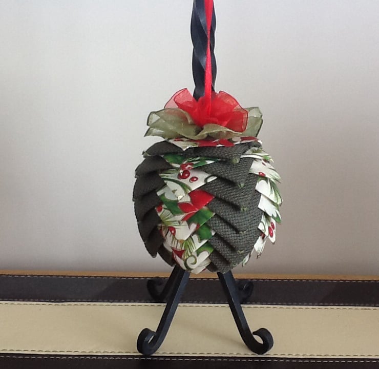 This lovely handmade Christmas Decoration will make a perfect gift for someone or to just hang on your Christmas Tree or in any room during the festive season. Its made from Olive Green Hessian ribbon and festive fabric in Cream/Red and Green. Its made with a 8cm Polystyrene Ball and small sequin pins. The top is tastefully decorated with a Green and Gold Organza ribbon. I've also added a finer Gold Lame ribbon to hang it with.