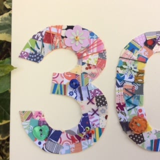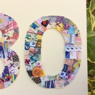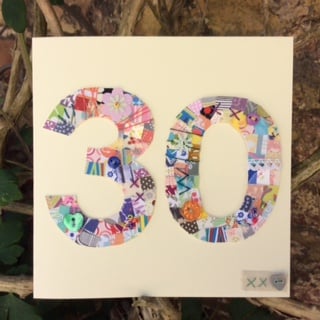 A beautifully made highly individual keepsake card. It is made with a patchwork collage of hand cut little squares of patterned papers and fabrics, with added buttons, beads and embroidery all hand stitched. It is the perfect way to send congratulations for a special 30th birthday. It measures 12.5cm x 12.5cm and is made on cream card, with cream envelope and comes in a cello wrap. It is left blank inside for your own wording.