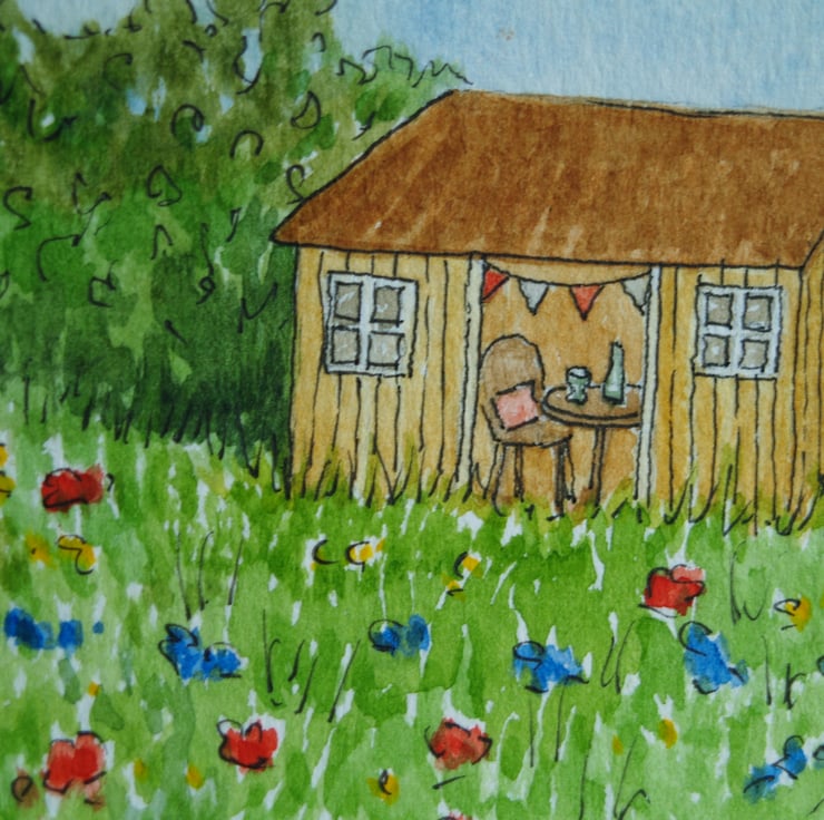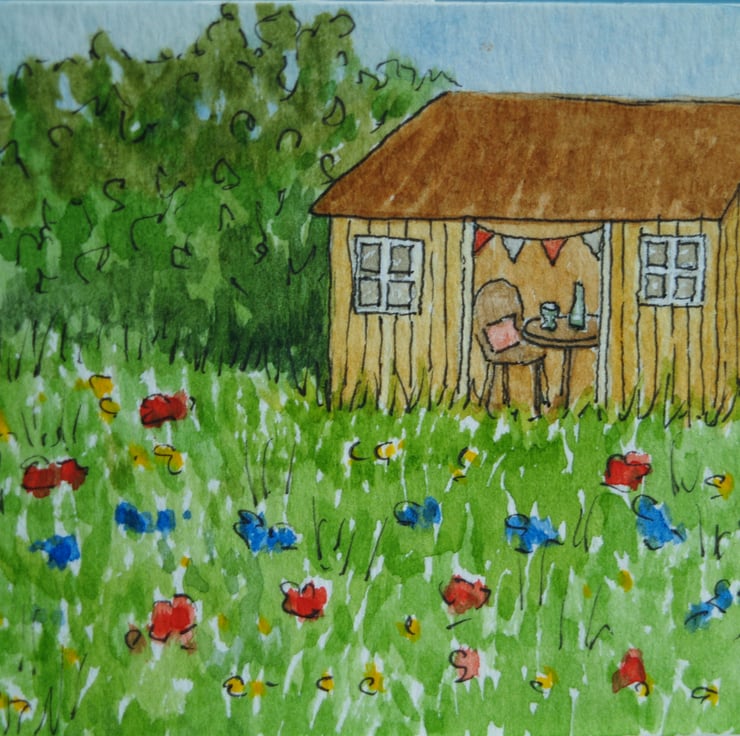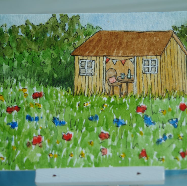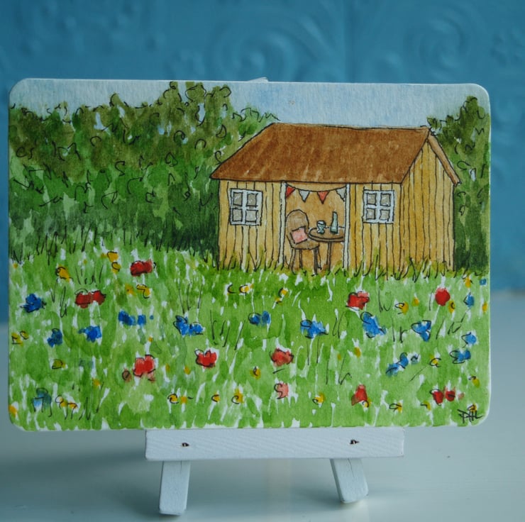 This is completely from my imagination! I haven't got a summer house, but ! liked the idea of one looking out onto a sea of wildflowers. This ACEO watercolour painting is how I thought it might look, with bunting and a table and chairs inside.