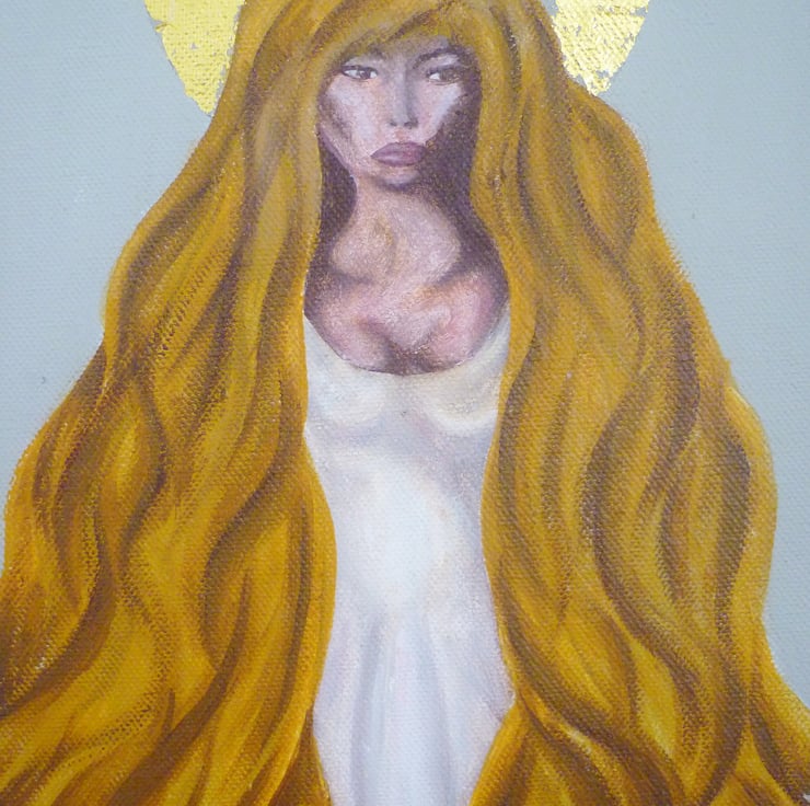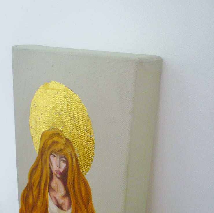 This hand painted depiction of Rapunzel is done in acrylic, with gold leaf for the halo effect around the head. It is painted on a boxed canvas, as shown in the third picture, so it will stand out from the wall a little.