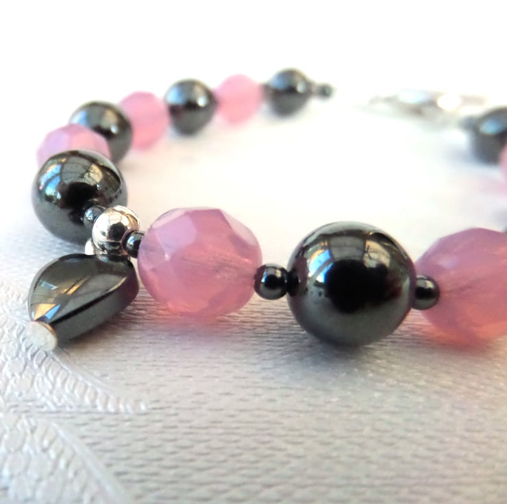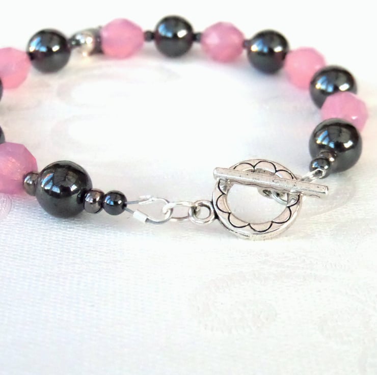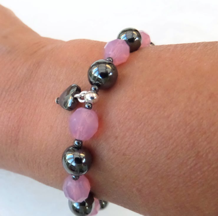Faceted dusky pink crystal looks great with polished hematite in this unique bracelet.