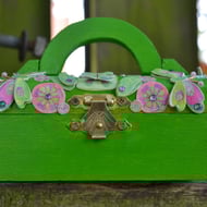 Wooden rounds have been cut from recycled wood from last year's unsold Christmas trees from a local provider. A striking butterfly, fairy charm and heart bead have been used together with teardrop gem stones to decorate this unique key ring.