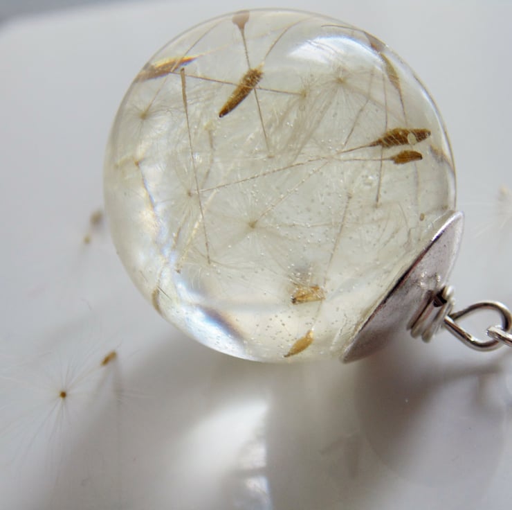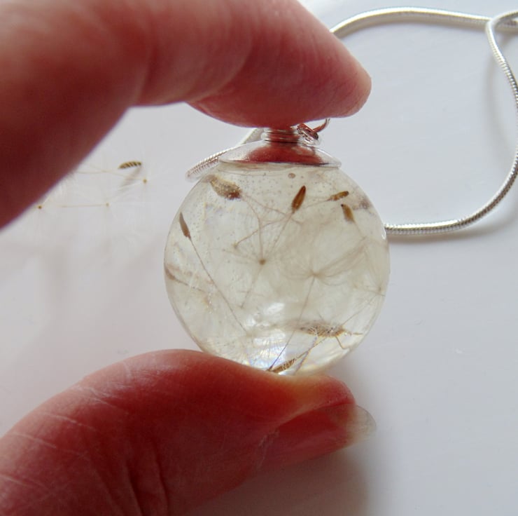 Description: I added these dandelion seeds to crystal clear resin, non toxic eco friendly clear resin, the effect is mezmerising magnified under the crystal clear resin dome. This large orb measures around 25mm. I have added a simple silver cap to top and t, hangs on a 18" silver plated snake chain.