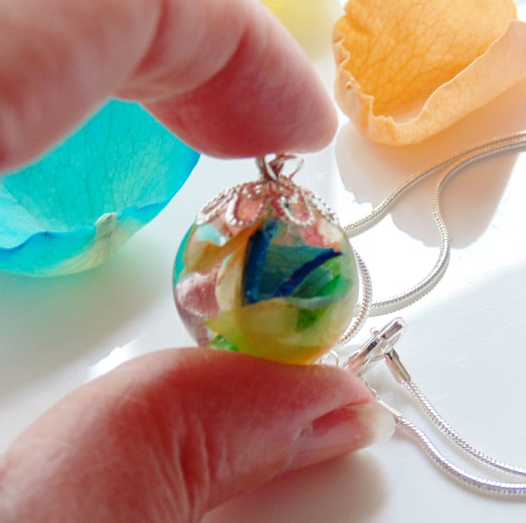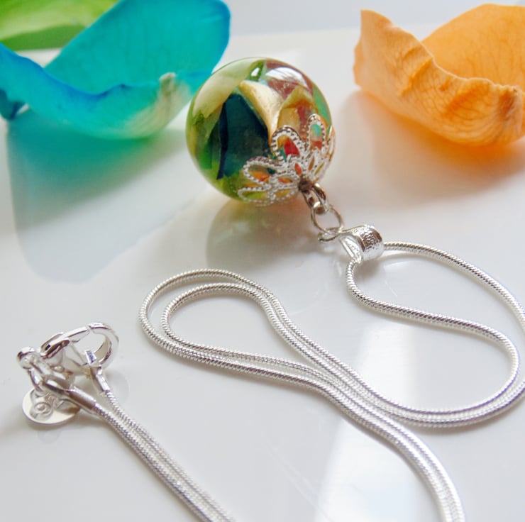 Description: I added these pretty vibrant colourful rose petals to UV resistant, non toxic eco friendly resin, This orb measures approx 20mm I have capped with a pretty ornate silver cab and hung on a silver plated snake chain. Love the way these petals are are captured forever within the resin, so pretty and colourful