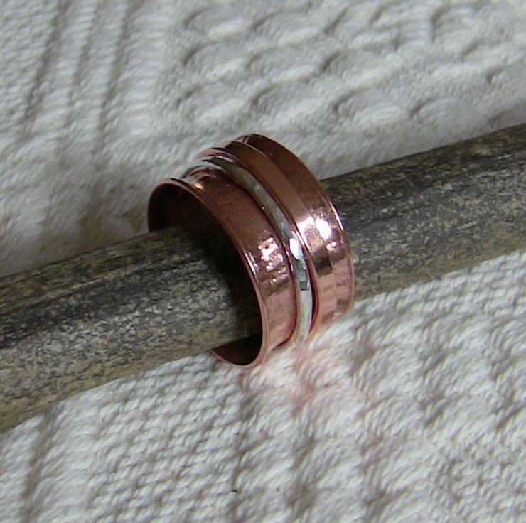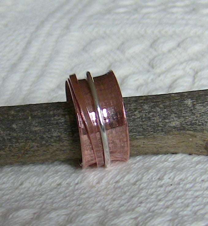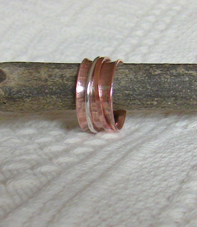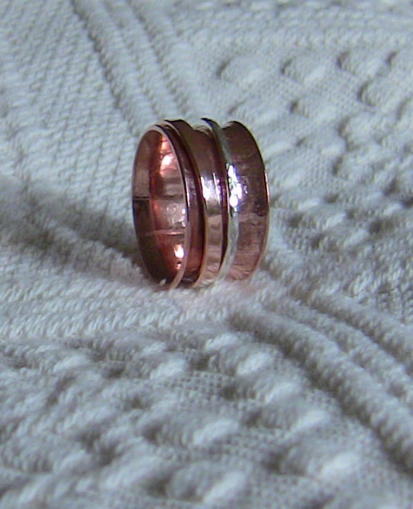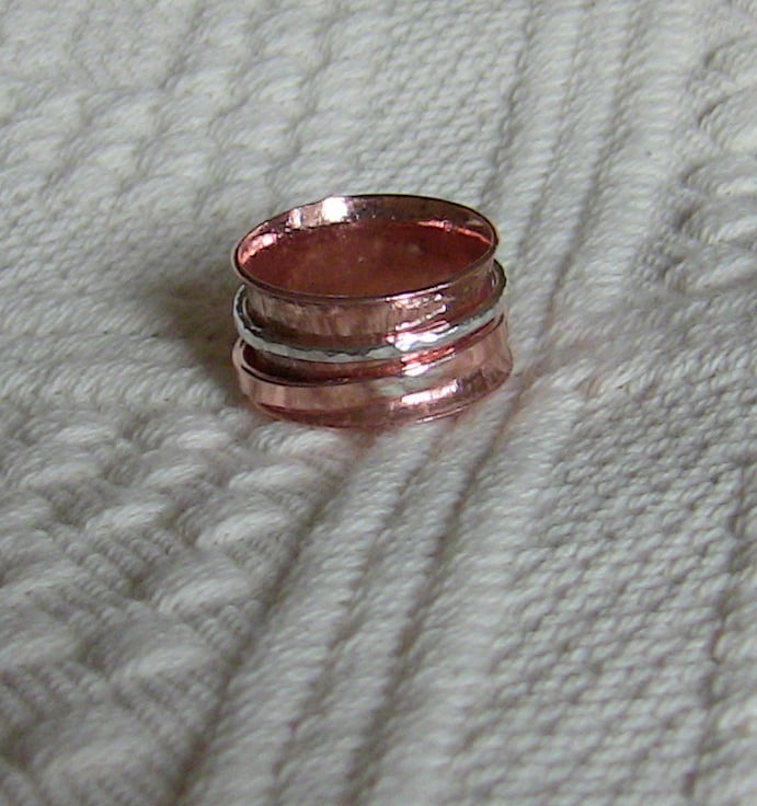 A gift for those with fidgety fingers! Like worry beads, a spinning ring can relieve stress and help you to concentrate. The inner copper ring is anticlastic in shape, meaning that the surface is convex around the circumference of the ring but concave in the vertical direction. This allows the two outer rings, made of sterling silver and copper, to spin freely. You can twiddle all day long!