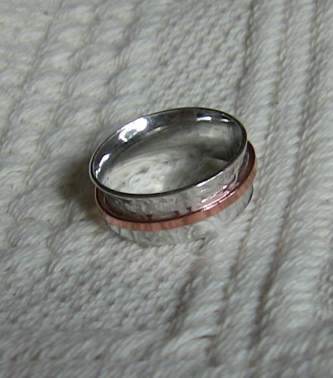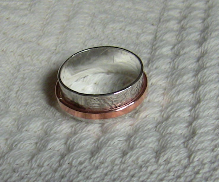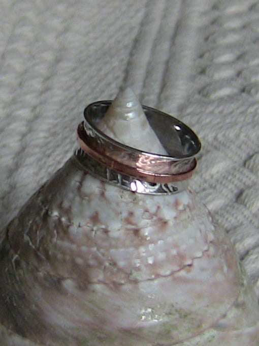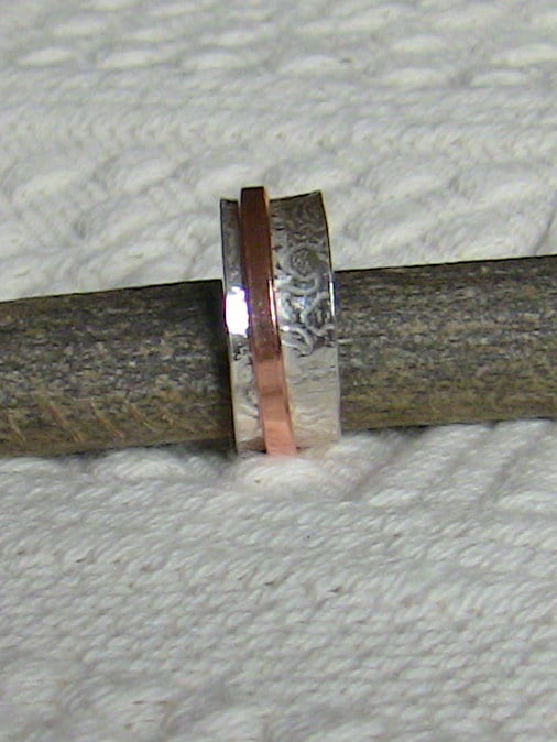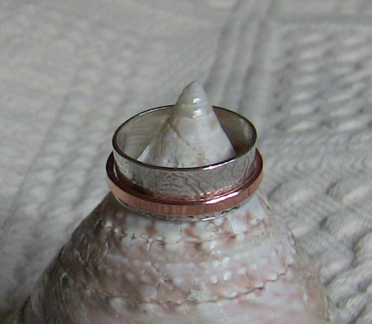 The inner ring is made of 9mm wide sterling silver which has been imprinted with lace to create a delicate surface texture. The spinner is made of copper, about 2mm wide, and both are polished to a high shine. I have one of these rings in stock: UK size T. If you would like a different size, just mail me with your ring size and allow a few days extra for it to be made up as a custom order. There may be small individual variations.