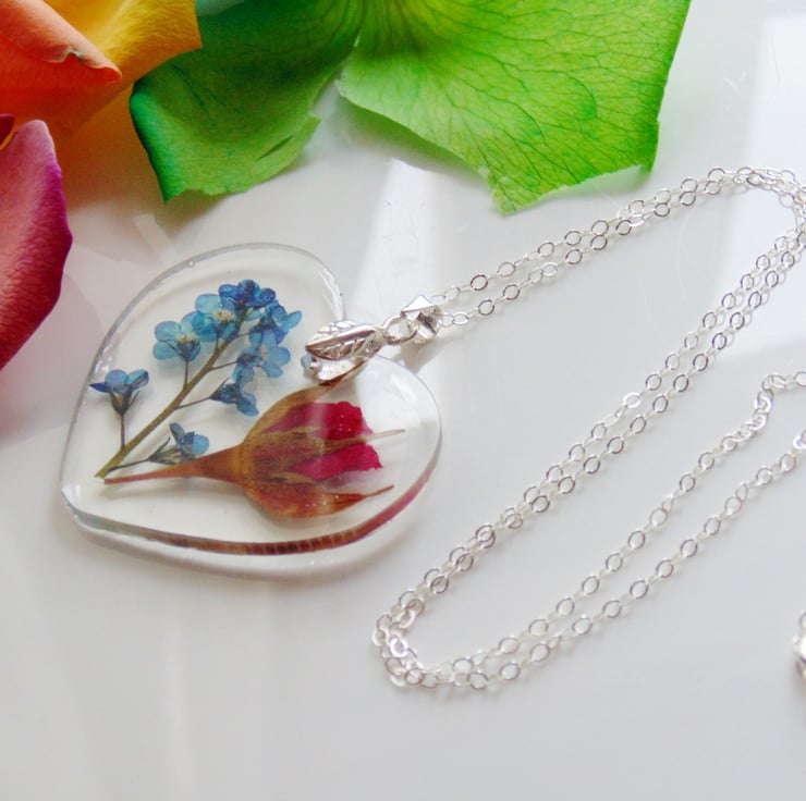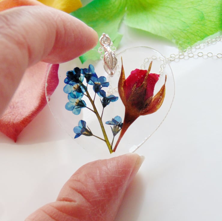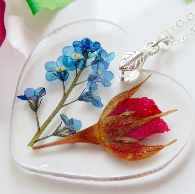 Forget me Not Necklace, Rose Pendant, Real Flower Necklace, Heart
