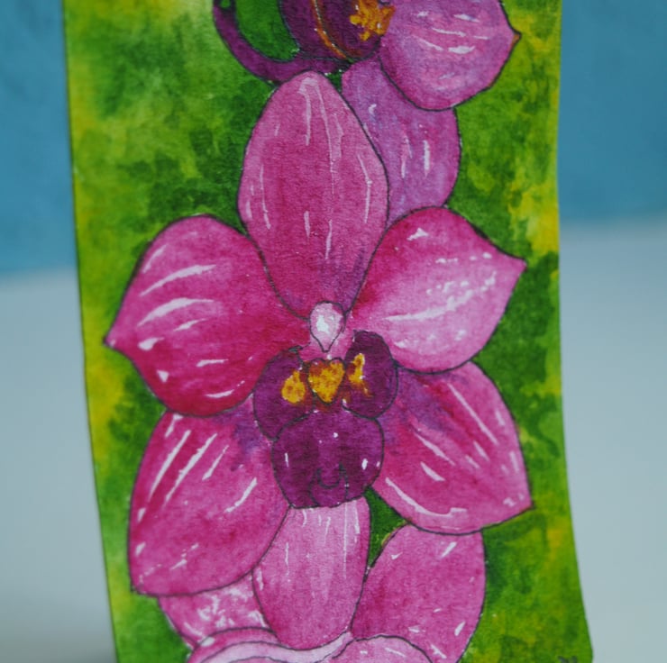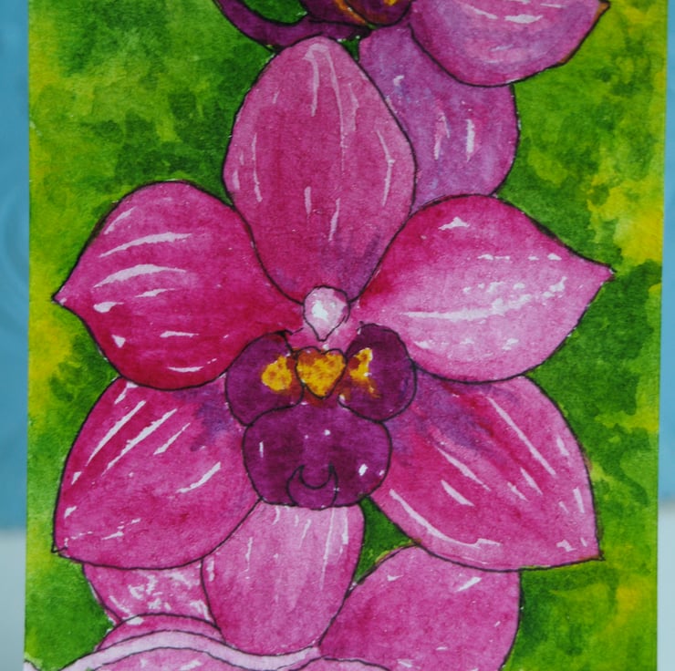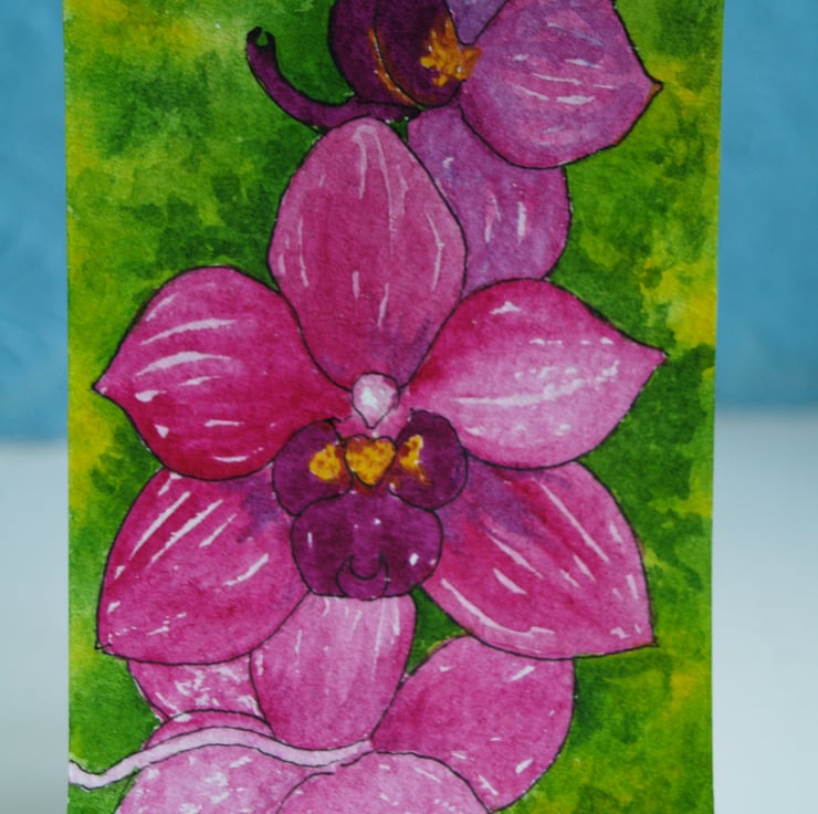 This ACEO is an original, handpainted watercolour of bright pinky-purple orchid flowers painted from life. It measures 2.5 x 3.5 inches (63 x 89 mm).