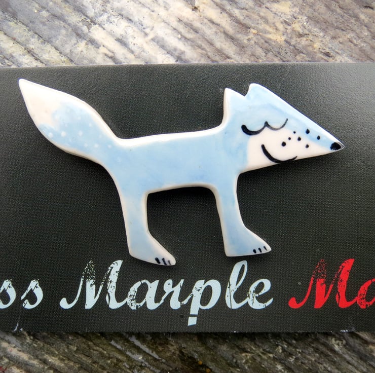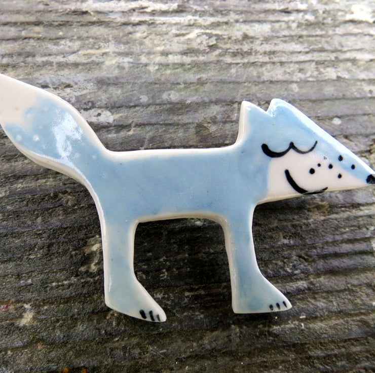 Light Blue Fox Guy Brooch handmade in porcelain.The piece is cut ,biscuit fired,handpainted with underglaze and finally glaze fired.A silverplated brooch pin at the back.