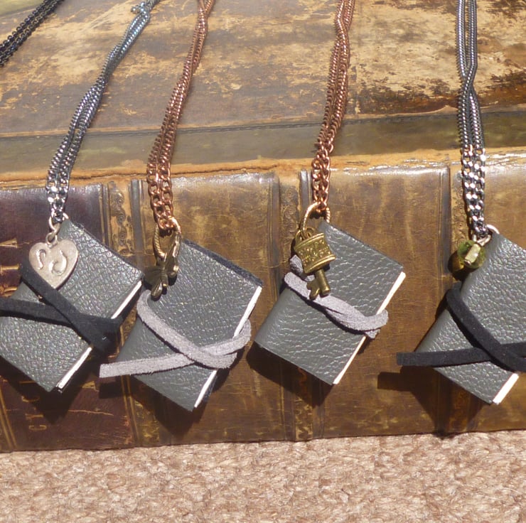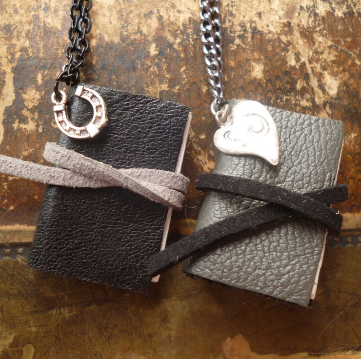 I have 5 in stock, each with a different charm and a sturdy black, silver or copper coloured chain. There's a butterfly, a horseshoe, a key& lock, a bead and a heart. Please let me know which design you would like when you order. Each book is approximately 2 x 3 cm and the chain is roughly 50 cm. The covers are black or grey leather (up-cycled from old boots and bags) with a suede tie.