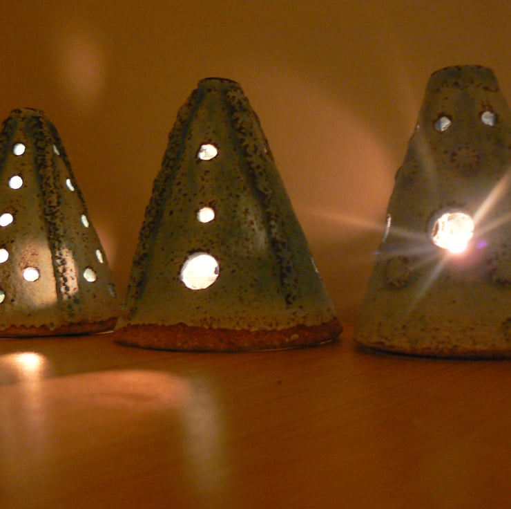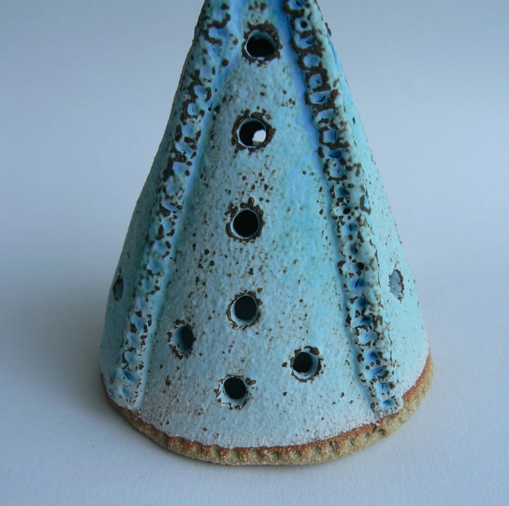 A stoneware fired candle holder in toasty buff ceramic with a dry turquoise glaze. The cone has holes to let out the light, there is raised decoration with impressed decoration. Underneath is a circular coaster to put the tea light on which has an impessed design around the edge and turquoise glaze. The whole piece is 9cm high and 8cm diameter. Please note the ceramic becomes hot when the candle is lit an LED candle could be used instead.