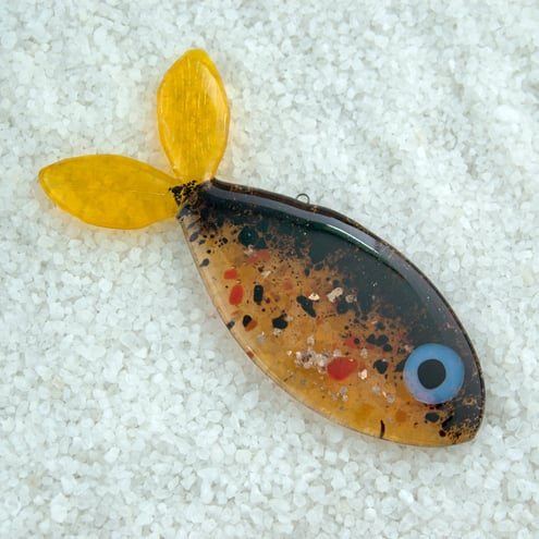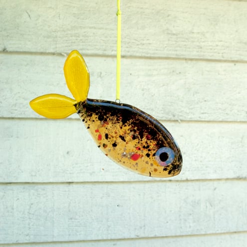 Created from layered amber yellow, orange, black, and clear Bullseye sheet and ground glass in my Whitstable workshop. The body, eye and fins are all hand cut and fused separately before being joined in another firing with the hanging wire secured in place. Final adjustments are made to the shape and then the whole piece is fired again. This design has many layers of differently graded ground glass to achieve real depth of pattern with iridescence and gold flecks which capture light beautifully. The yellow tail has a delicate ribbed effect. A pale yellow satin ribbon is attached to complete the design.