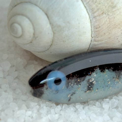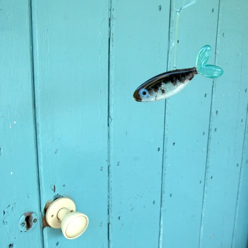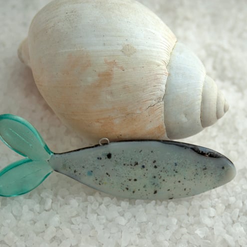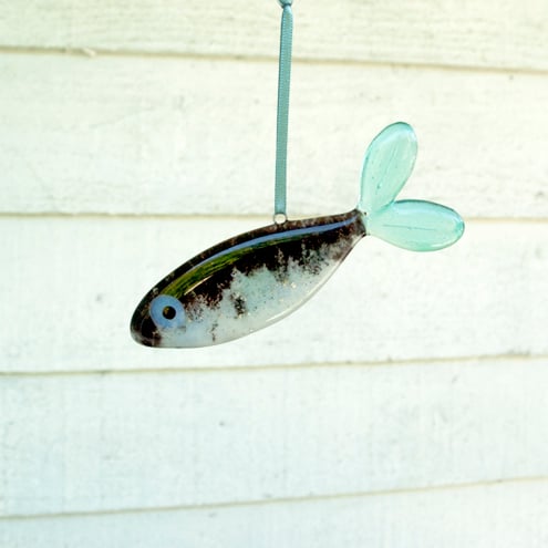 Created from layered grey, blue, black, and clear Bullseye sheet and ground glass in my Whitstable workshop. The body, eye and fins are all hand cut and fused separately before being joined in another firing with the hanging wire secured in place. Final adjustments are made to the shape and then the whole piece is fired again. This design has a delicate mackerel pattern and silvery flecks within the glass in addition to a multicoloured glittery surface which captures light beautifully. The pale blue tail has a delicate ribbed effect. A pale blue satin ribbon is attached to complete the design.