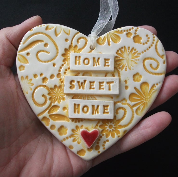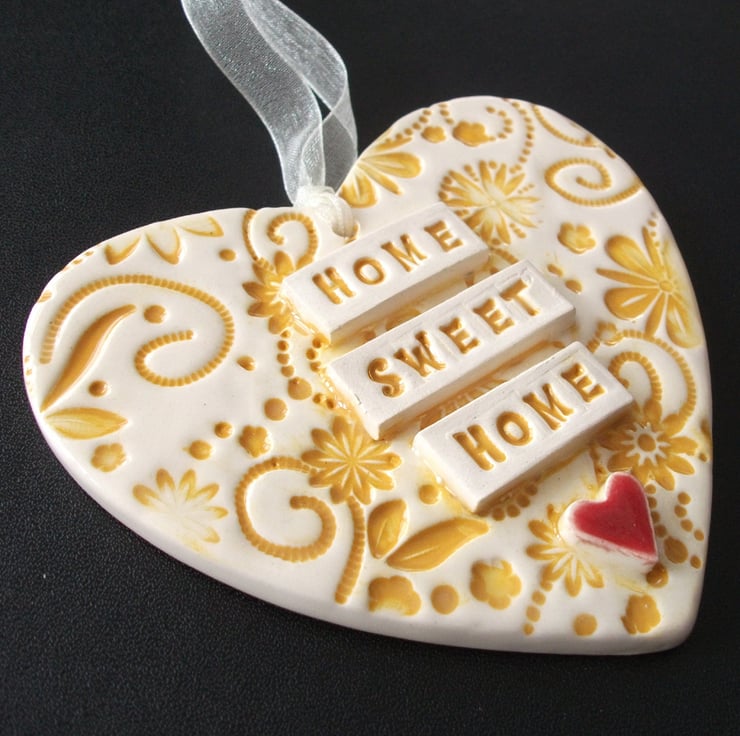 This ceramic heart is made from white earthenware clay and decorated with the words, Home Sweet Home.