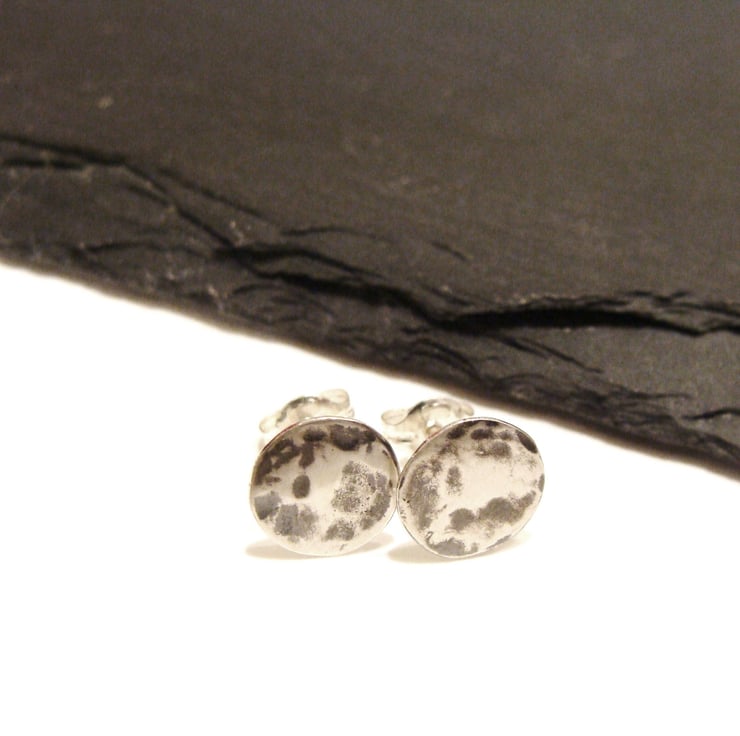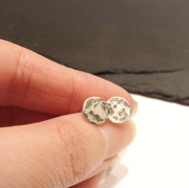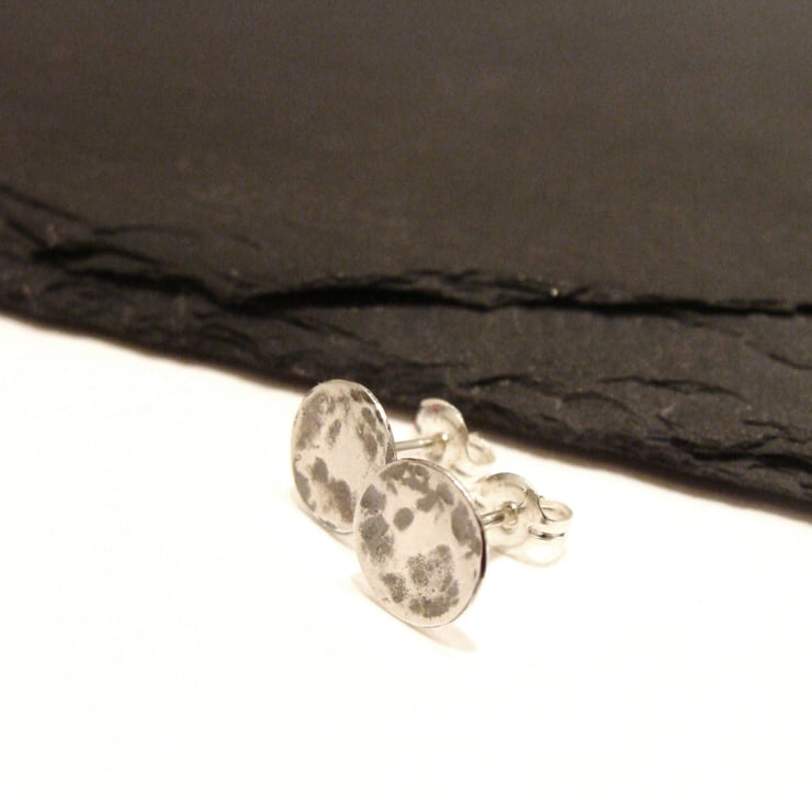 Dainty hammered sterling silver round stud earrings reminiscent of a full moon. Cut, soldered, oxidised and buffed by hand.