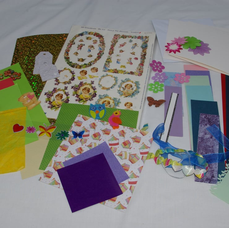 A pack full of paper crafting supplies. The pack contains lots of different items to make hand made cards with. They might also be used in scrap booking. This is a great starter pack for entertaining the children on a rainy day.