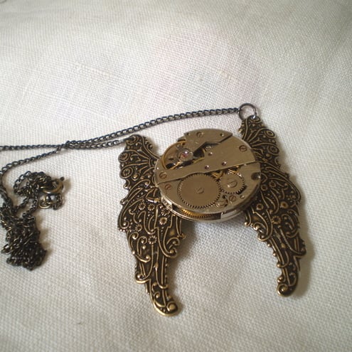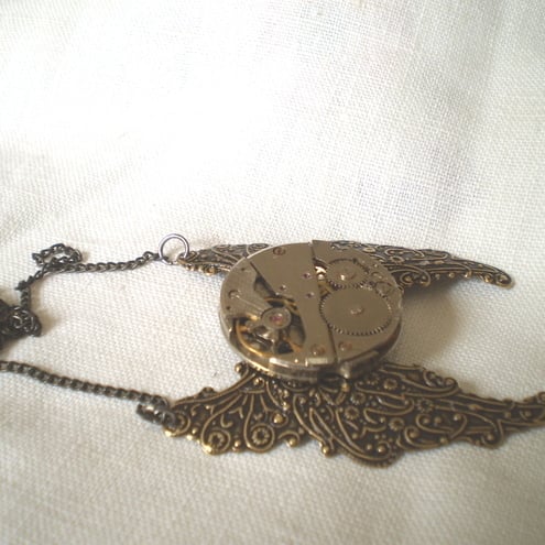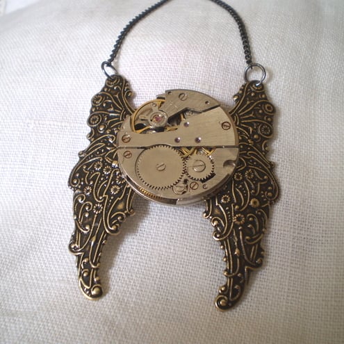 For the Angel in you ... or for any Angel you may know. This unusual necklace has a wonderful Vintage pocket watch movement as a central focal point and adorned by two antiqued ornate wings. Hangs from an 18 inch chain.... perfect for Halloween, as the fallen angel