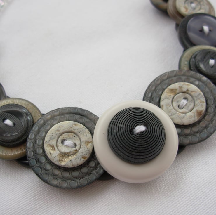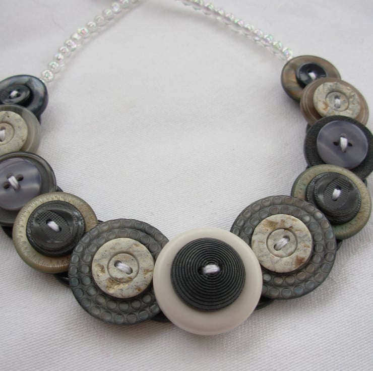 I've made this layered and stacked button necklace from assorted black, grey and taupe coloured buttons - threaded and knotted with 6 strands of embroidery thread and finished with little clear AB beads and toggle clasp
