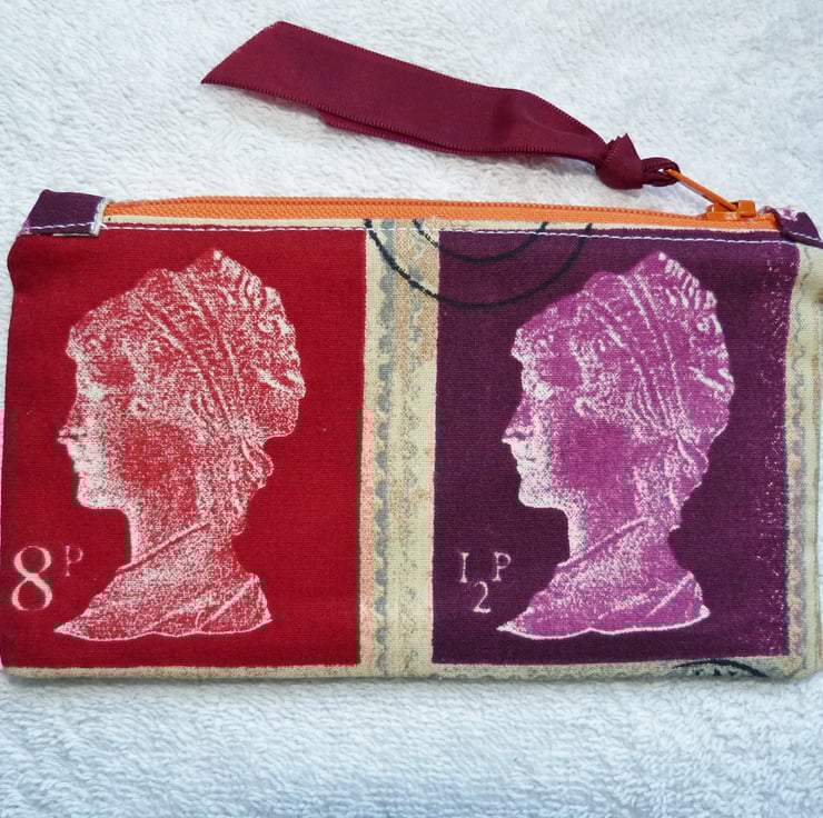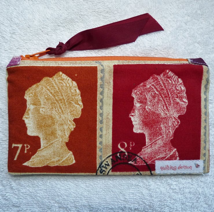 I have created this lovely purse from a Prestigious Stamp cotton fabric. The purse is fully lined in a plain unbleached cotton and has a ribbon zip pull closure.