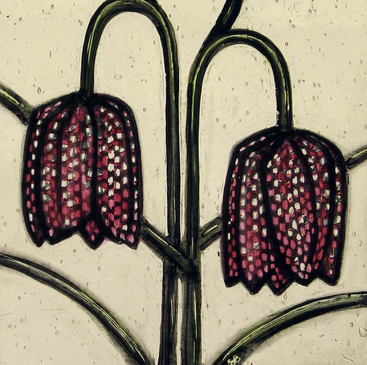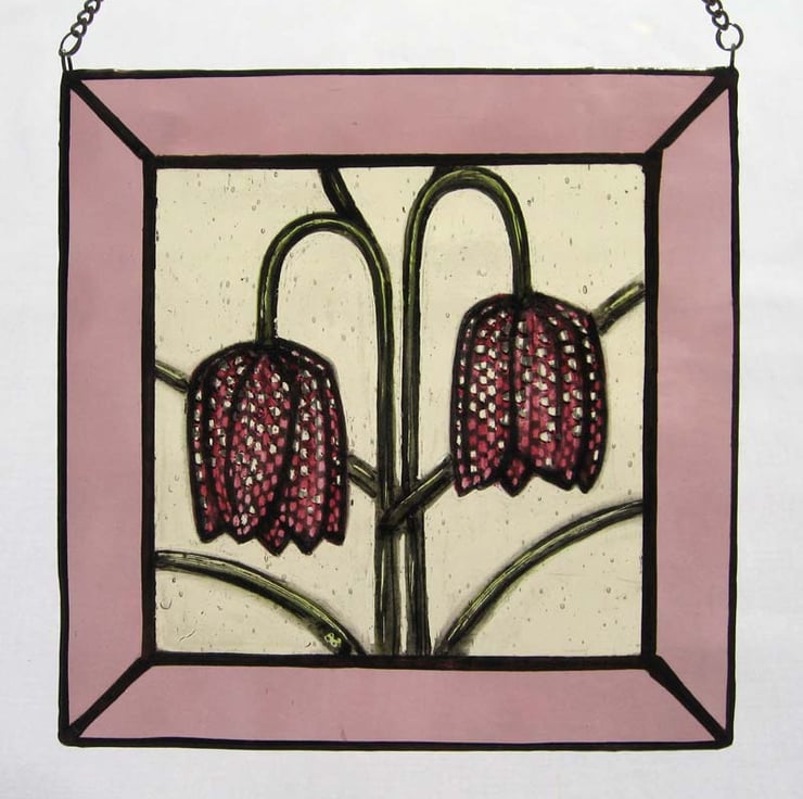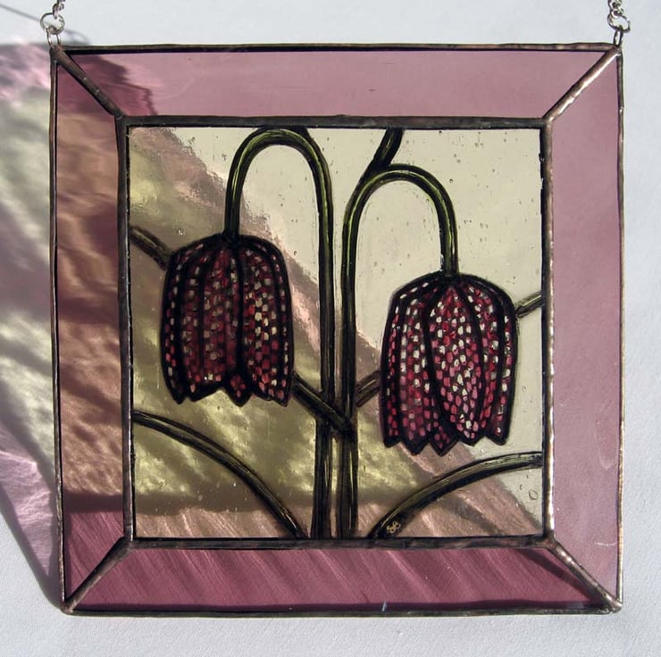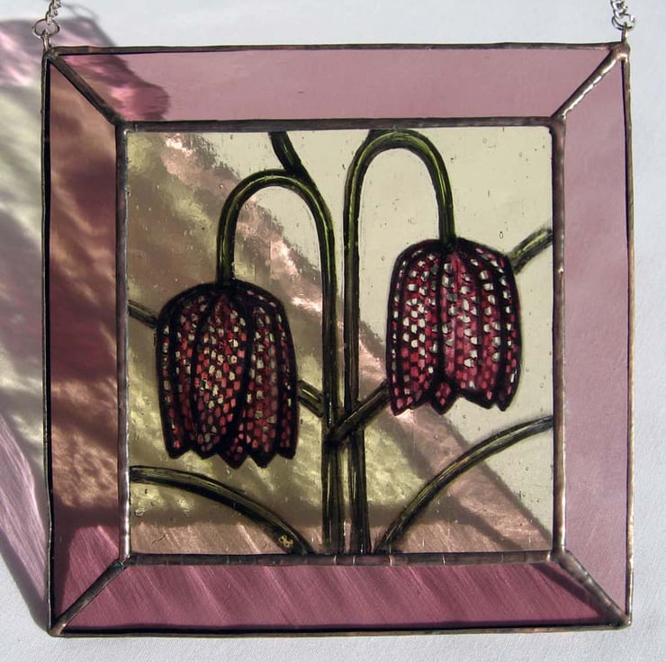 There is a hidden touch of romance with the heart shape created by the stems. The painted centre square has been assembled and soldered together with delicate purple-pink glass creating the frame.