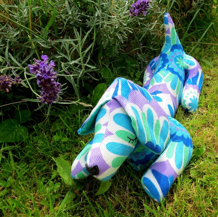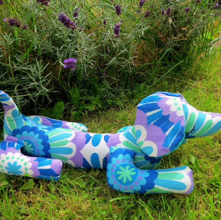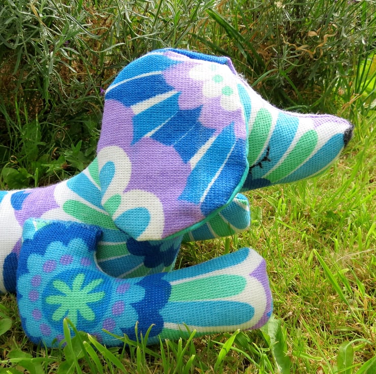 Made from a fabulous flower power fabric from the early 1970s, she is gloriously retro.