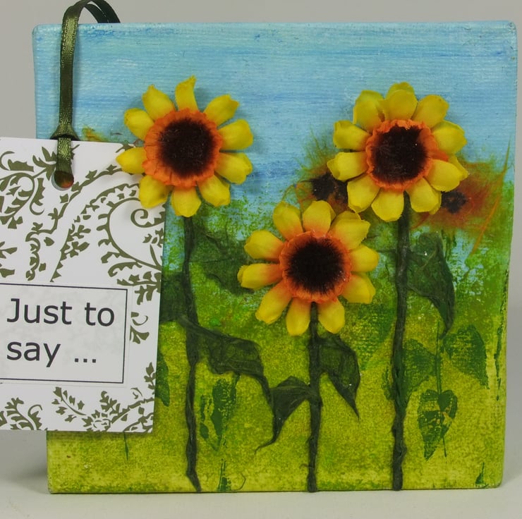 The background of the wrap-round design is painted in acrylics and collaged with textured tissue paper. The sunflowers have fabric flowers and textured paper stems.