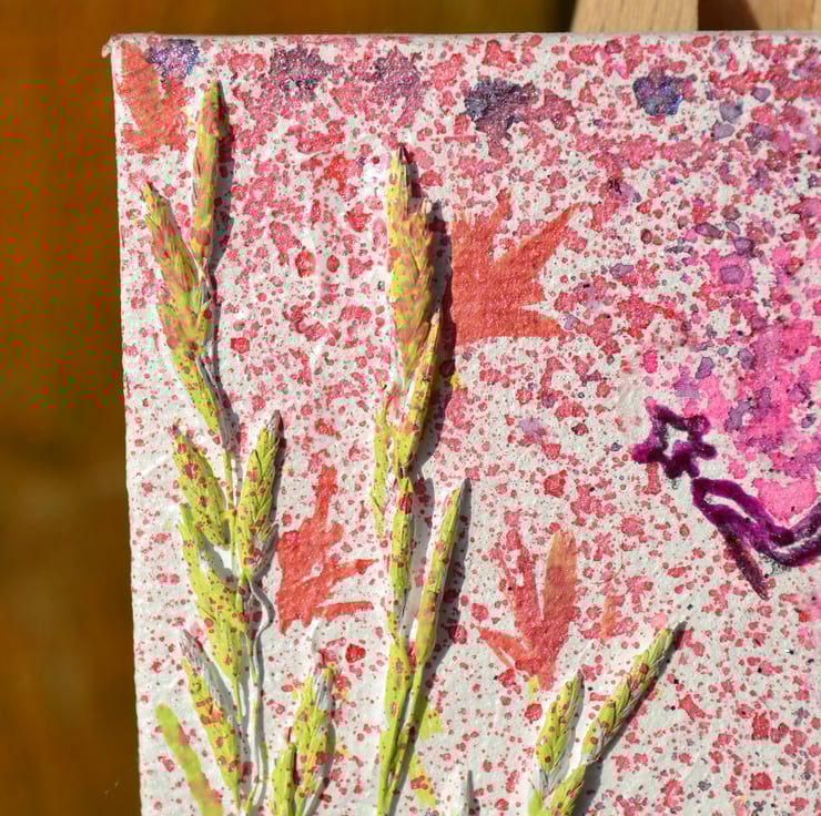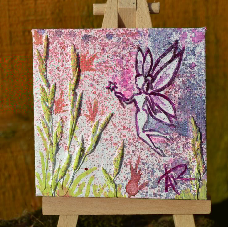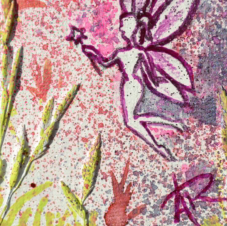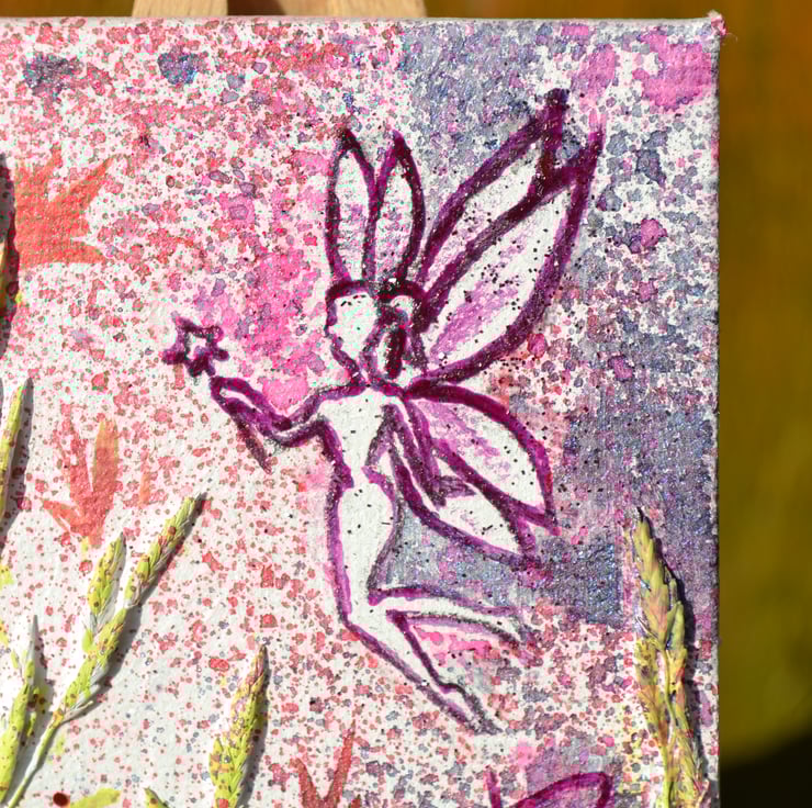 Reeds have been dried and adhered to the canvas and then shimmer painted with greens, blues and pinks gold and a purple silhouette of a fairy waving her magic wand. A dusting of glitter has been added to finish it off.