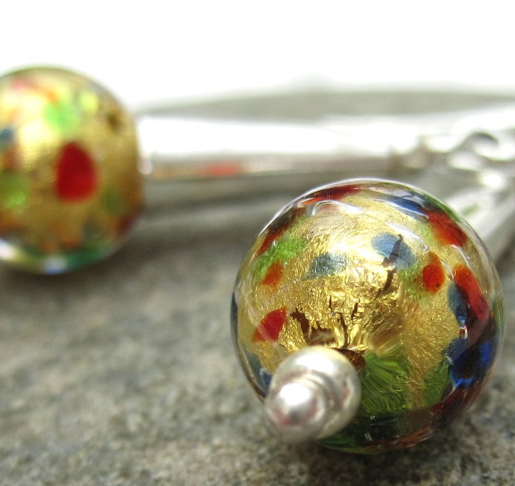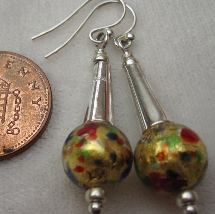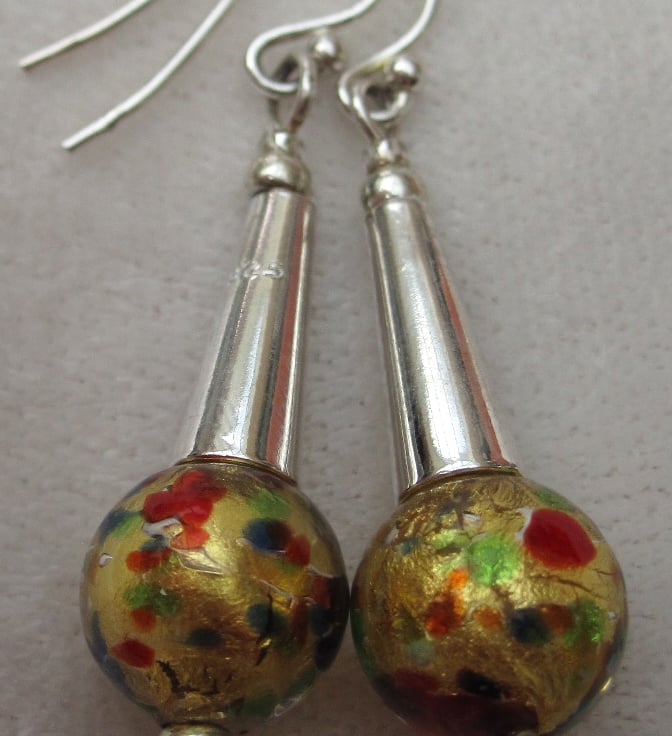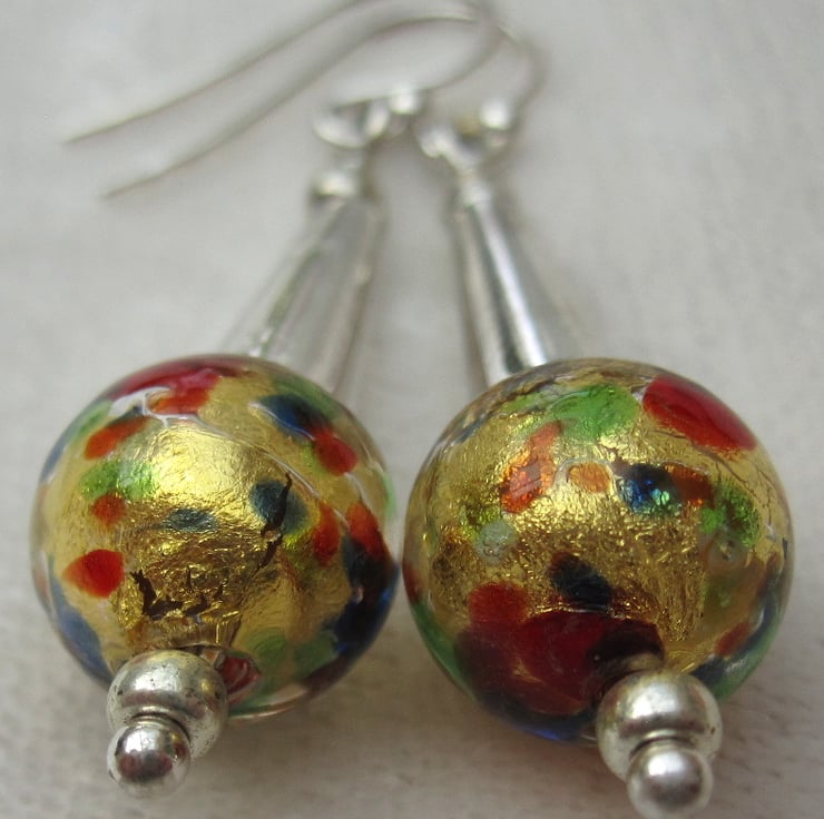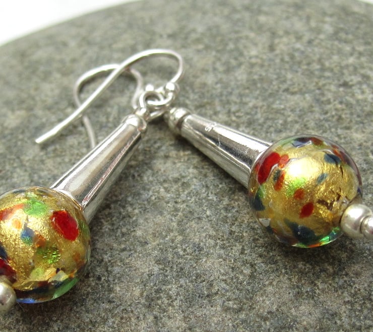 Luxury golden earrings made with venetian murano glass and sterling silver details. Pretty bright colours float over gold leaf within the glass. On a sterling silver hooks, they are bright & wearable. The little cones are shiny sterling silver.