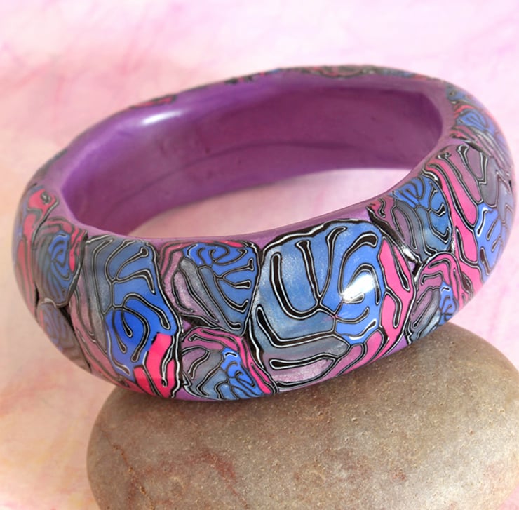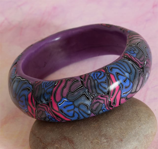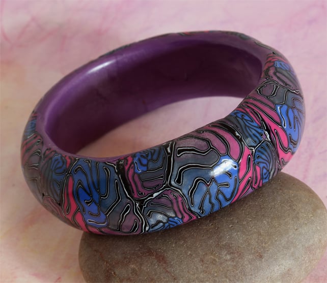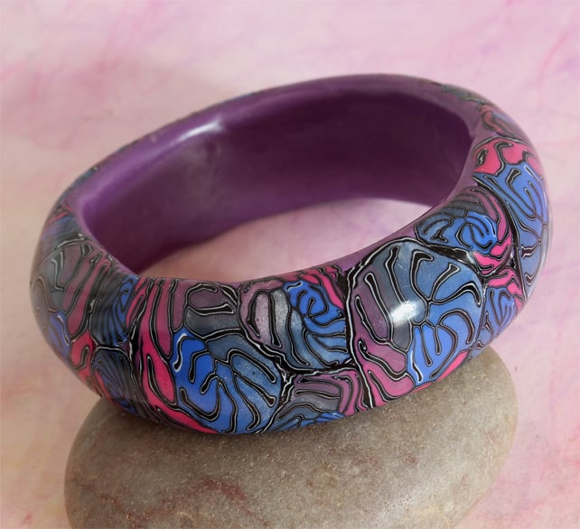 Intricate and elaborate convolutions of tones and hues have been carefully applied to give this groovey chunky bangle.It is hand crafted from polymer clay and is highly polished, lightweight and comfy to wear. It is pretty well standard bangle size. A sophisticated example of gothic psychedelia.