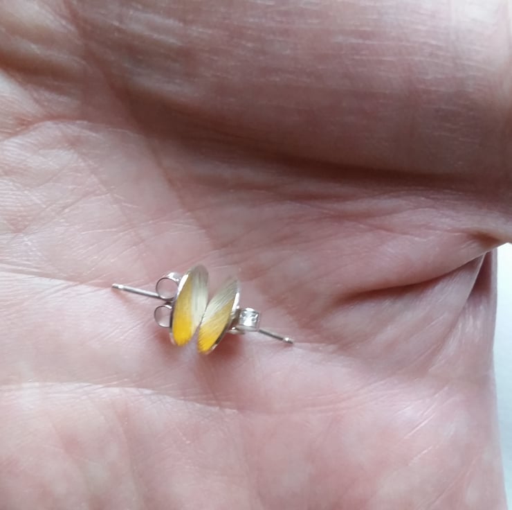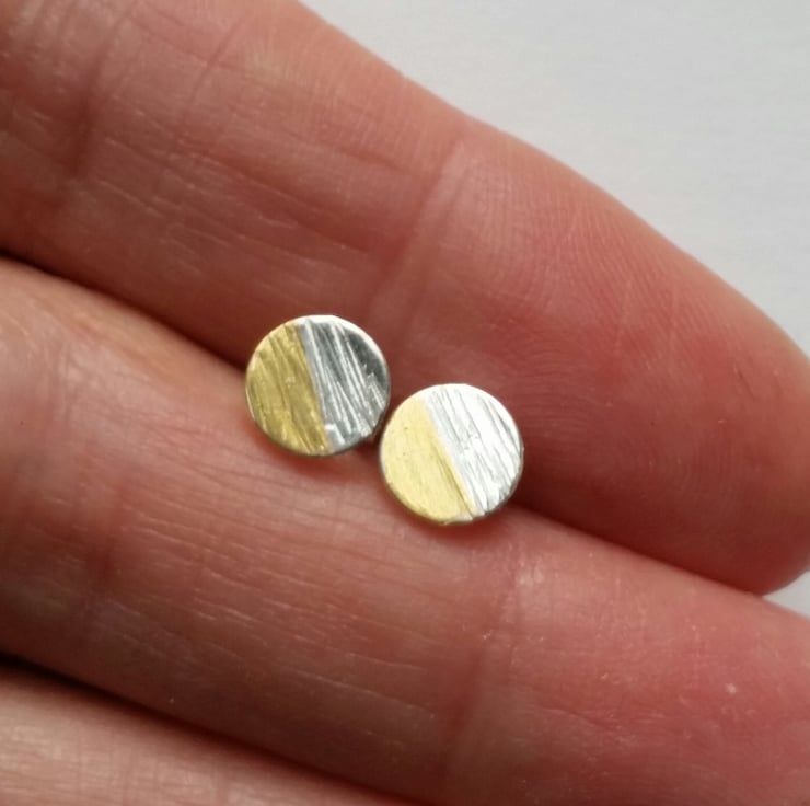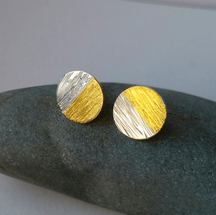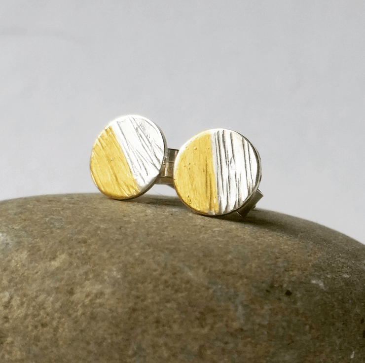 This is a pair of sterling silver textured stud earrings with delicate 24 ct gold which have been added using the ancient Korean process of Keum Boo.